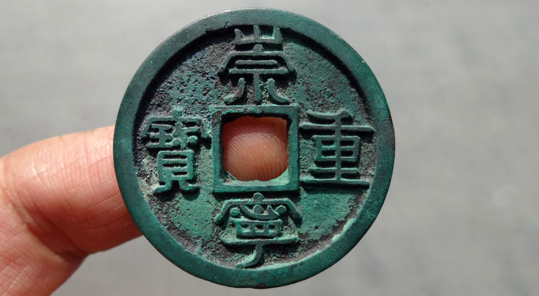 极美崇宁重宝背巨月,挑头重,字口犀利,少见,无漏裂,如图,喜欢的朋友不要错过。