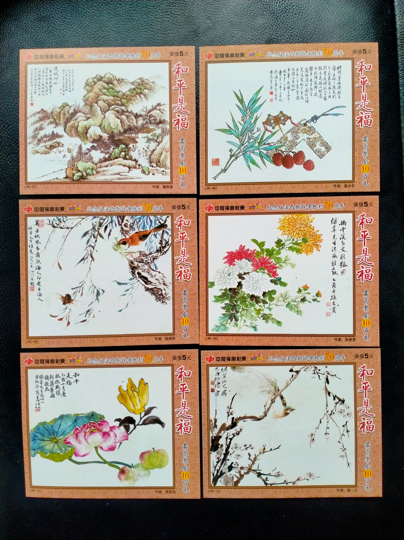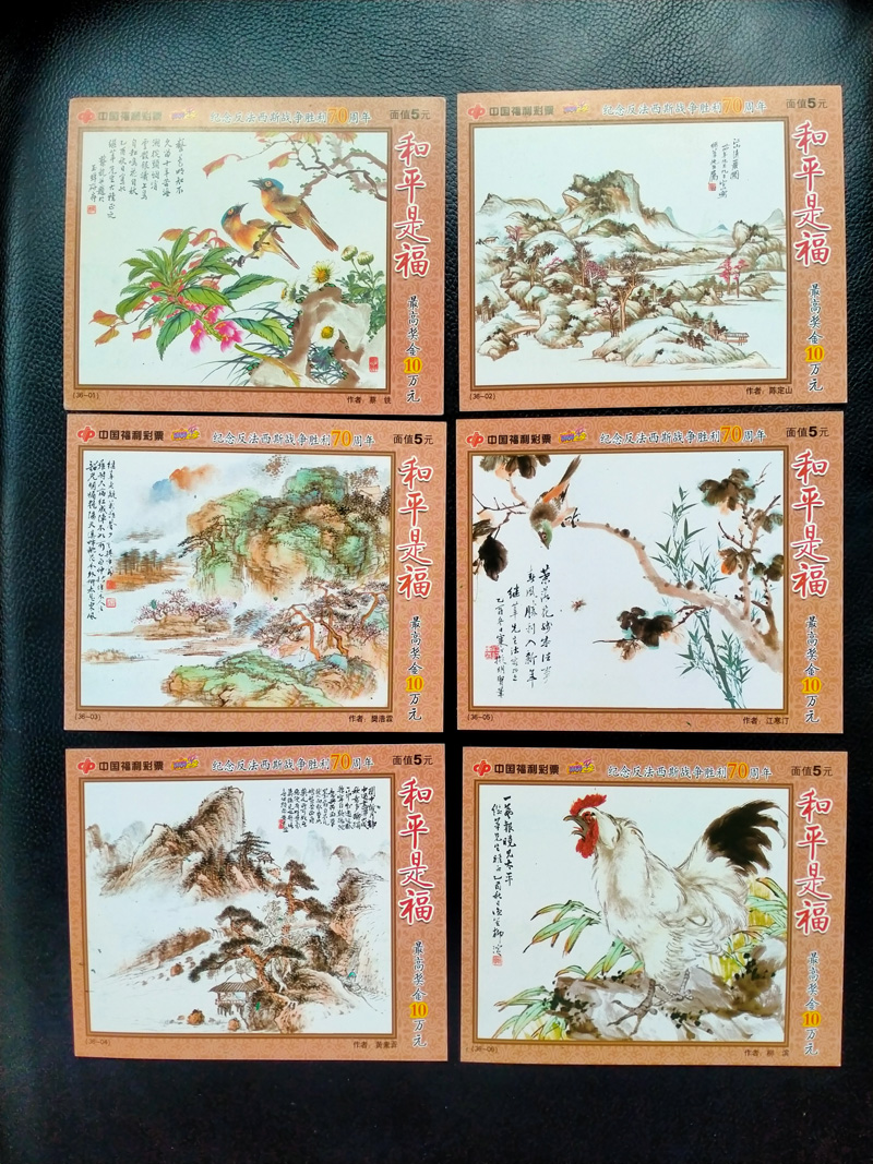 这是为纪念反法西斯战争胜利70周年设计的主题彩票,画家用书画的艺术形式挥毫泼墨纪念战争胜利,意义重大而深远。票面所选用的国画是1945年抗日战争胜利时,由上海著名医生继莘先生提议、著名画家朱屺瞻先生筹划,邀请张大千、徐邦达等38位当年的海派文人墨客以“还我河山”、“欢庆胜利”、“和平是福”等为主题创作的一系列画作。弘扬了反法西斯战争中各国人民团结一心、共纾国难、勇于担当、共同奋斗、砥砺民族复兴的爱国主义情怀和精神。这套彩票是36枚一套,除刮开密码外,基本无磨损、无折痕,算是98品吧。