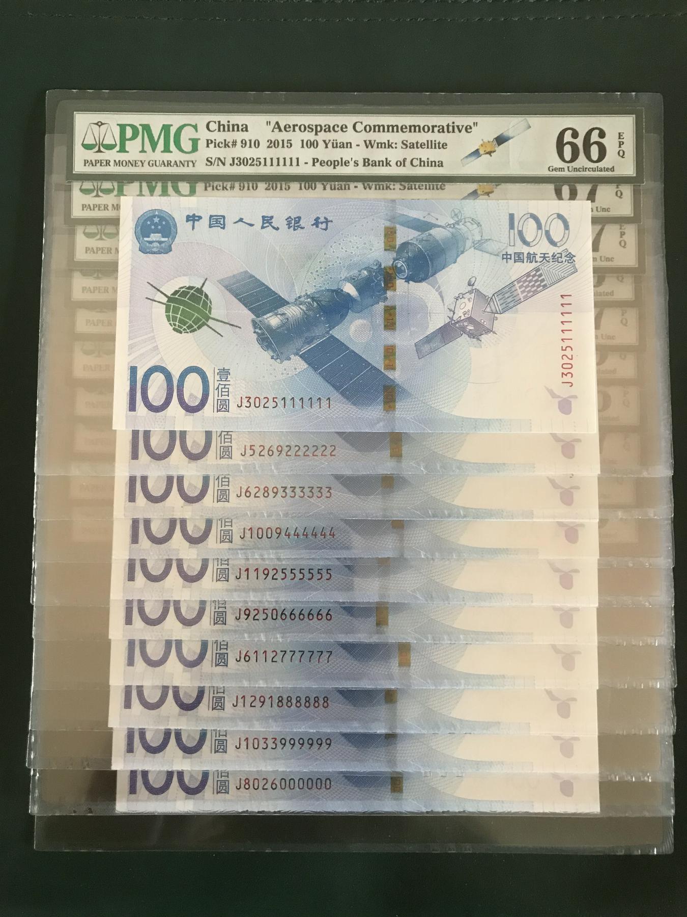 航天钞PMG评级币: J3025111111,66E; J5269222222,67E; J6289333333,67E; J1009444444,66E; J1192555555,67E; J9250666666,66E; J6112777777,66E; J1291888888,67E; J1033999999,67E; J8026000000,66E; 航天钞六同组,航天钞的顶级藏品; 售:8.5万元,包顺丰。直接确认有效。