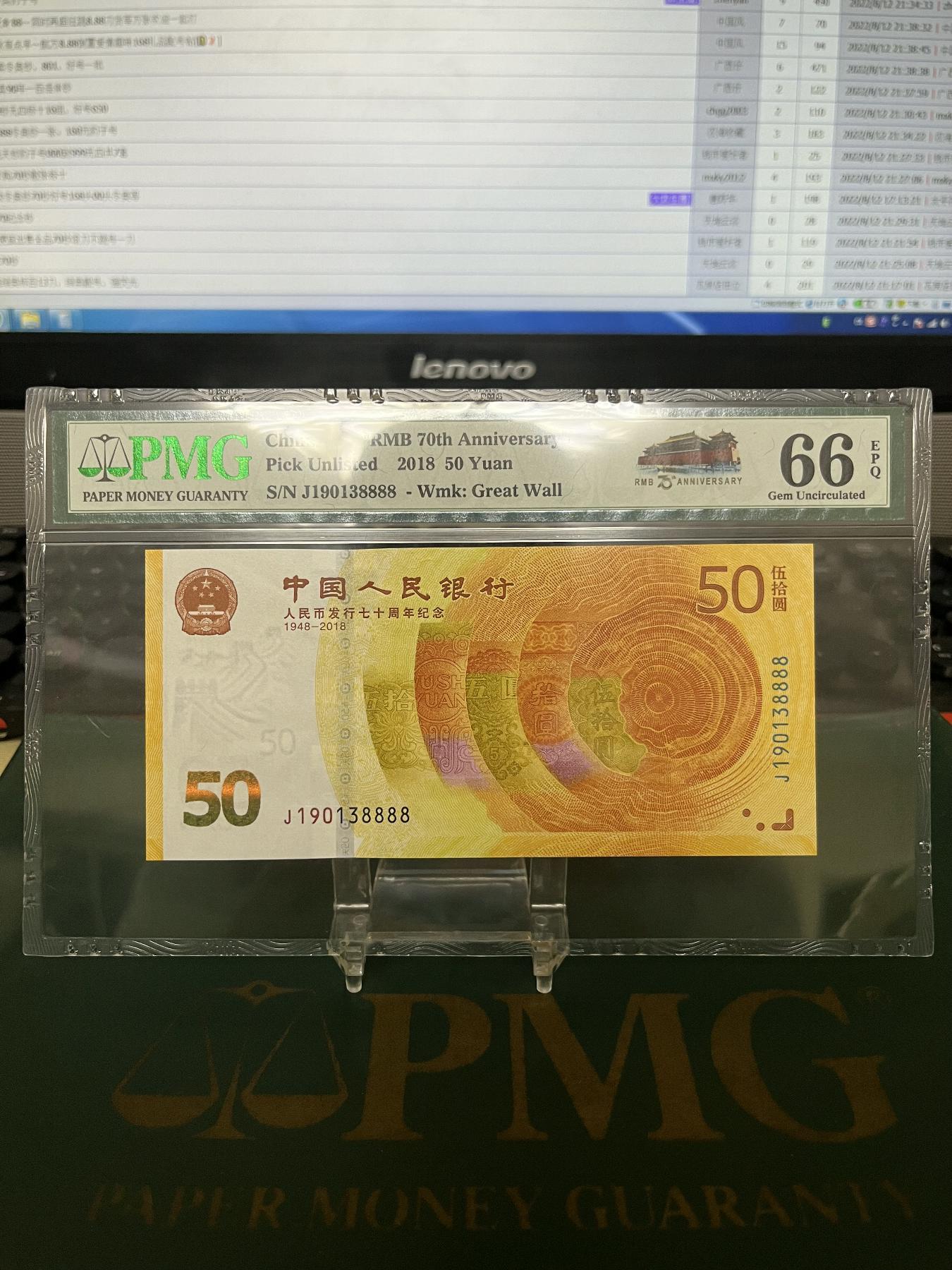 70周年纪念钞: J190138888 PMG66E,一张; 补号狮子号,一生发发发发; 售:1680元;包顺丰。直接确认有效。款到发货