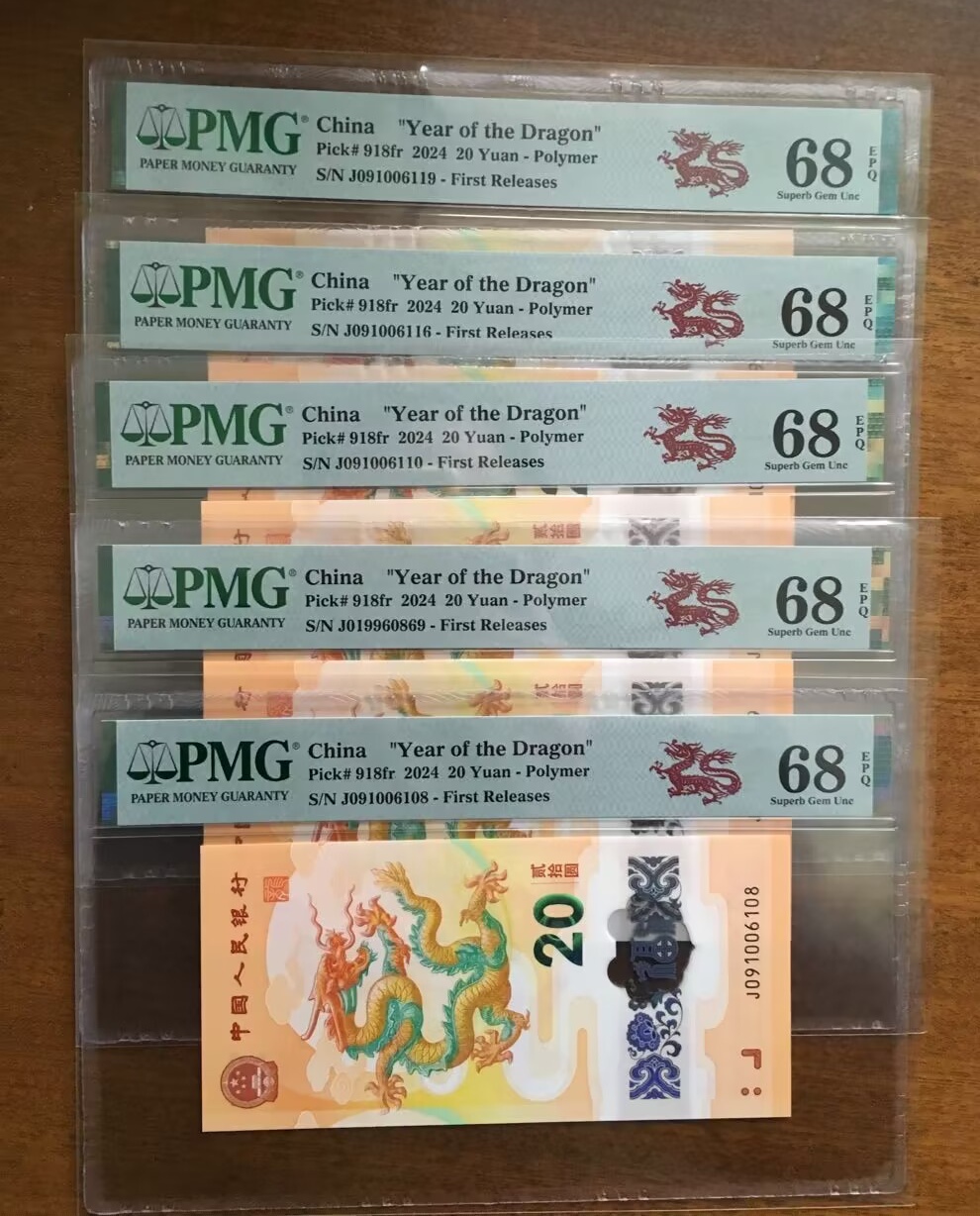 PMG首期龙标68高分, ①倒置4张(780元×4): J091006119龙四; J091006110龙四; J091006116ABBA尾+龙四; J019660869五福倒置+年份; ②尾8倒置售价1500元,号码J091006108, 以上J09全部为关门冠,欢迎送购,非诚勿扰
