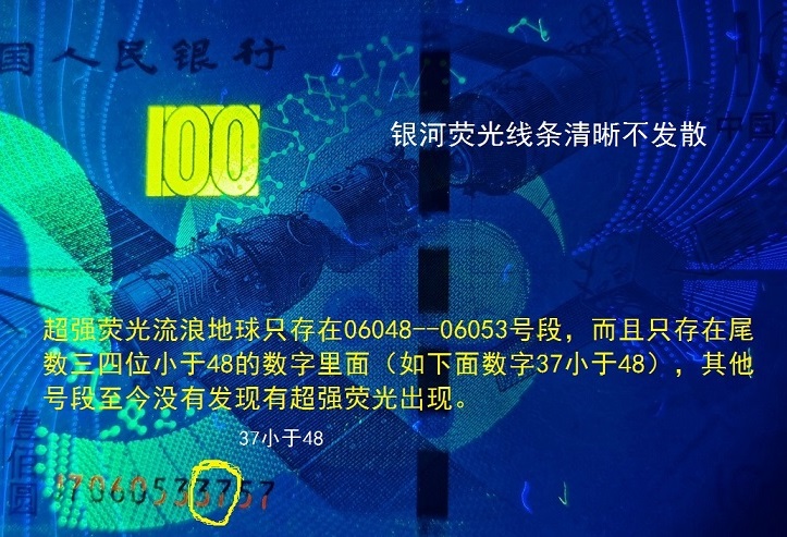 航天钞流浪地球,是中国钱币历史上唯一 一枚纪念钞荧光和纪念钞题材结合最贴切的纪念钞,题材重大,设计精美,特别是荧光画面美不胜收,航天钞发行以来,当年就荣获华盛顿钞票会议的“最佳新钞创新”二等奖;2016年荣获新加坡亚洲高级安全印务会议(HSP)“最佳纪念钞”大奖;2017年国际货币事务联合会(IACA)获得“最佳纪念钞”二等奖。其中航天钞荧光流浪地球的发现为该钞再添了绚丽的色彩,称它为中国历史上第一荧光钞一点也不为过。该钞分为强荧光和超强荧光两种版别,由于市场低迷,起码有一半以上航天钞回流银行并销毁,根据多名资深玩家多年研究得出结论,强荧光流浪地球存世不超过5万枚。特别是06048—06053号段超强荧光流浪地球,根据市场流通数量统计,超强荧光流浪地球存世不超过500枚。收藏潜力巨大,你发现其中的机会了吗?