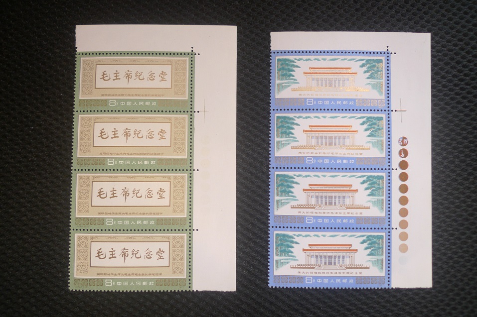 2、主席纪念堂有上直角边4联,2—2色标漏印,有圈色淡,2—1色标正常,280