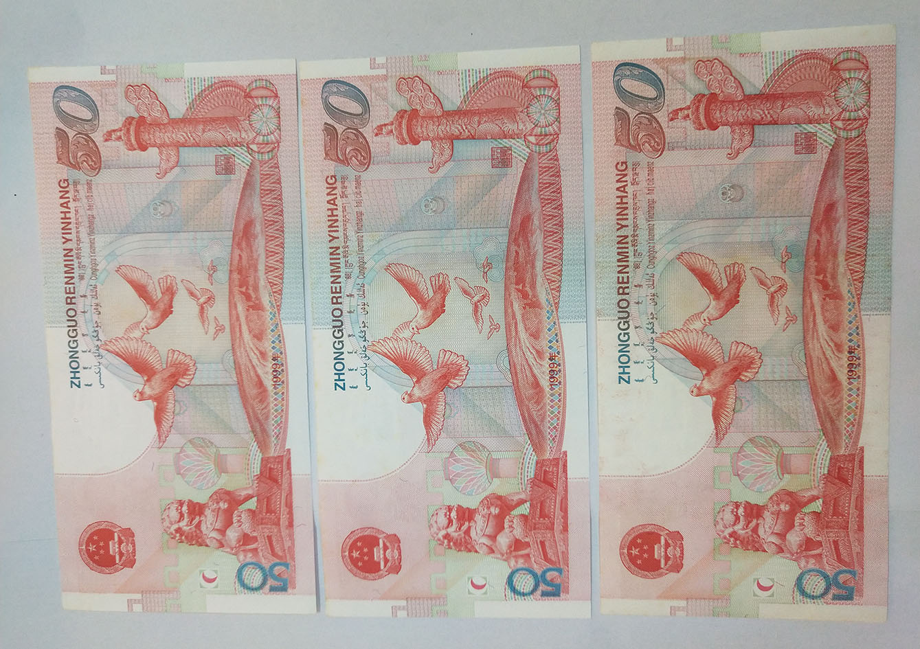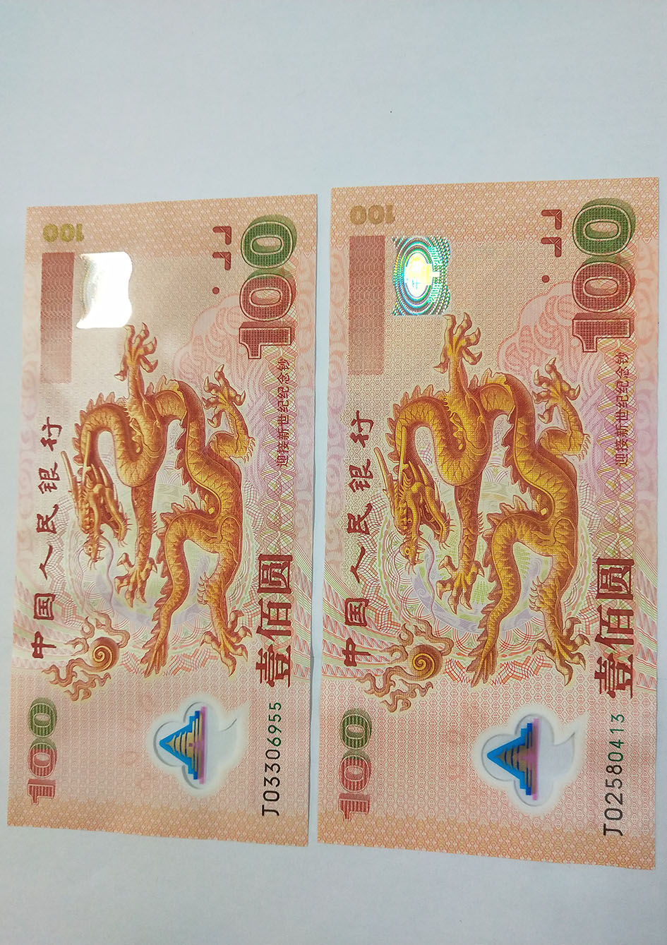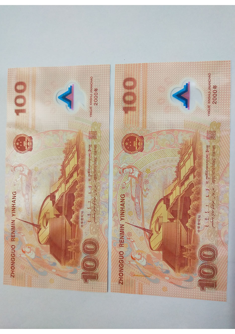 世纪龙钞原票无掉皮从册子取出来有轻微波浪一张无47双尾一张高4合售2650元 建国钞3张倒署号有黄斑合售1280元 先款以我确认为准