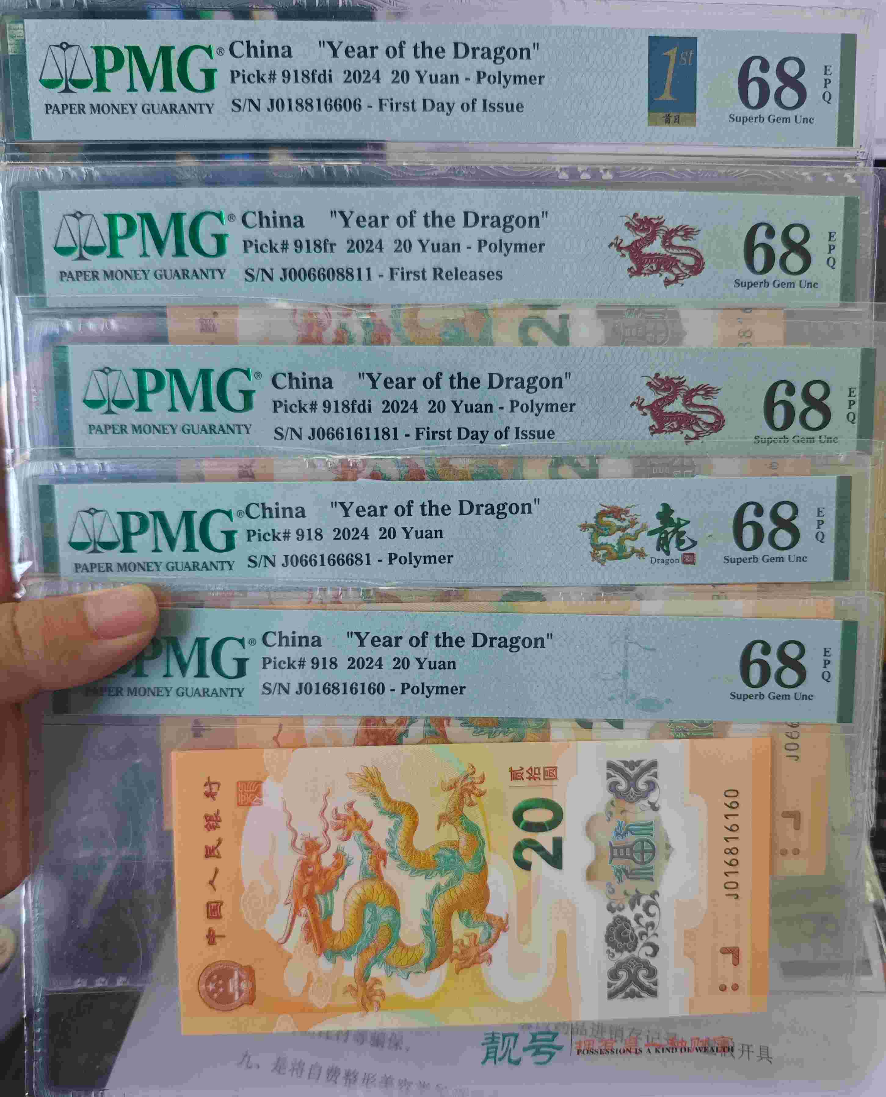 出五张龙钞pmg68分0168。