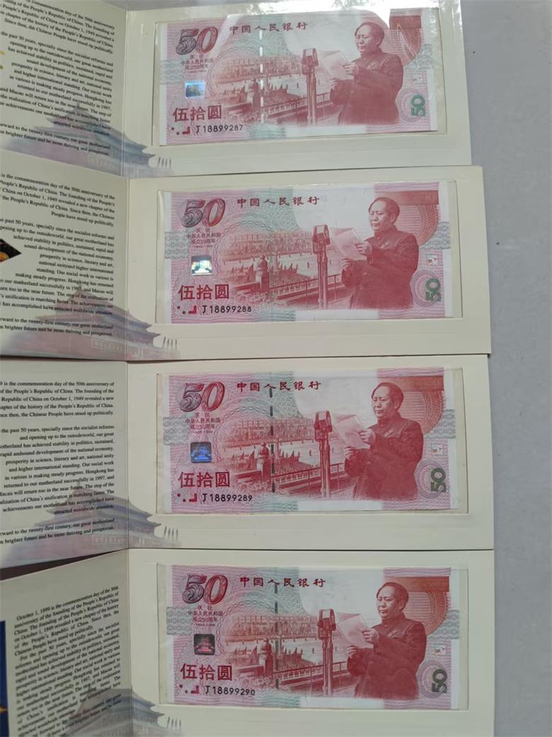 建国钞康银阁发行的套装,四张连号,内含无3457朦胧尾88,红灯笼,灯下有点微斑,一起1400