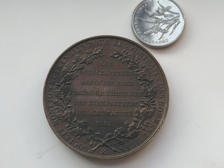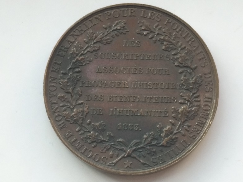 1833年法国富兰克林和蒙蒂恩协会铜章,42MM,32.67克左右;