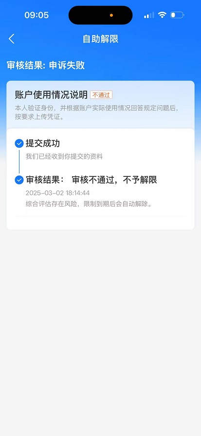 -- 作者:沈阳大壮 -- 发布时间:2025/3/3 9:22:00 -- 我是第一次遇到这种情况 资金能不能到我这也是个未知数 我只能不断申请解封支付宝 我支付宝现在里面还有好多钱也拿不出来 我也很懊恼 |