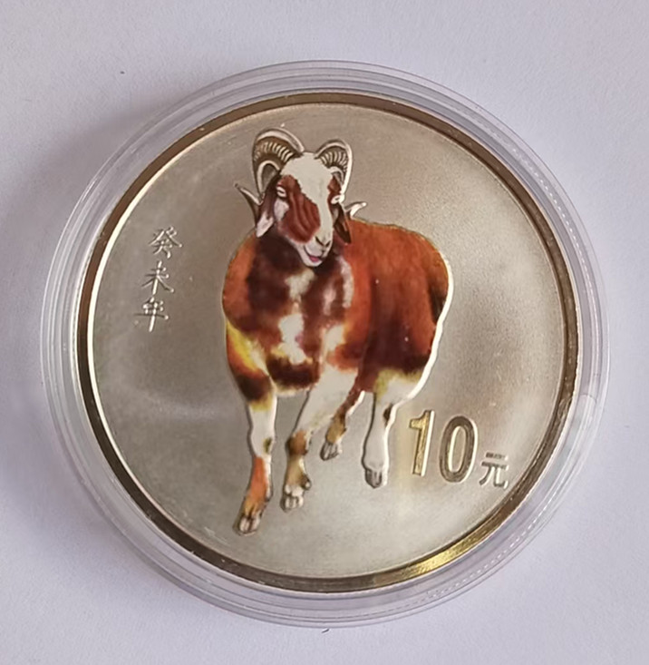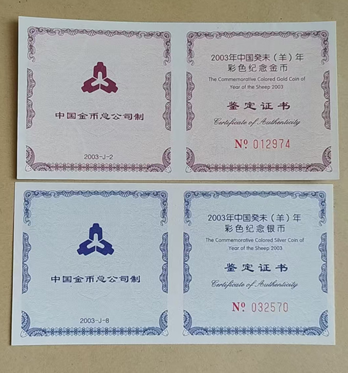 2003年一轮生肖彩金羊,重量1/10盎司。发行量3万枚。彩银羊发行量10万枚。重量1盎司。全品。品如图。证书全。两枚一起出售2600元包快。