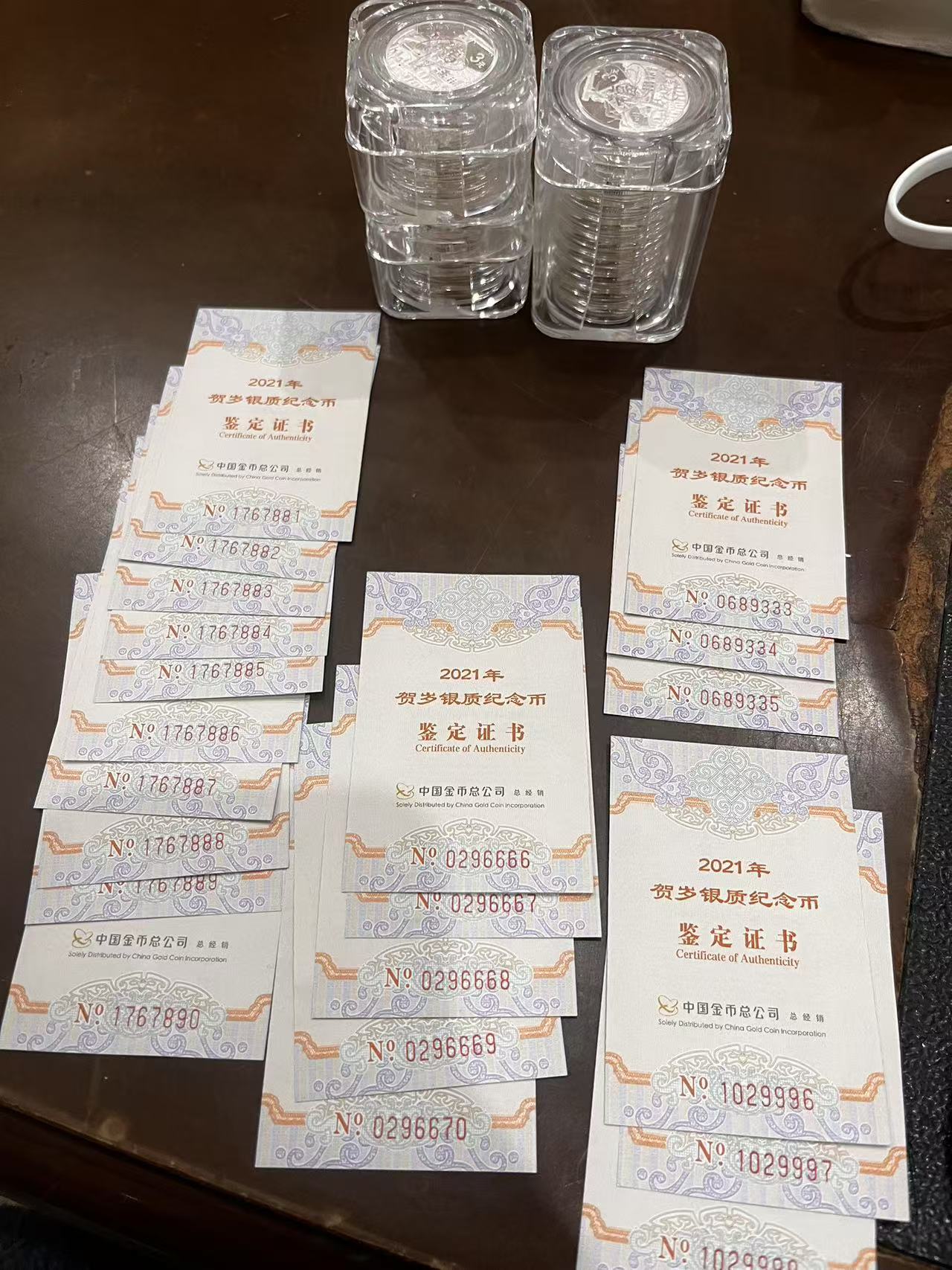 -- 作者:晨曦168 -- 发布时间:2025/2/12 20:49:00 -- 90出21年贺岁银币3元的证书含888,6666,998,333等靓号 一共21枚 一起走 没有卡册 带证书和银币 送卡桶 90元一枚 号码非常舒服 无4尾881标十 无3457尾6666 尾333 还要尾9998 收藏的好品种