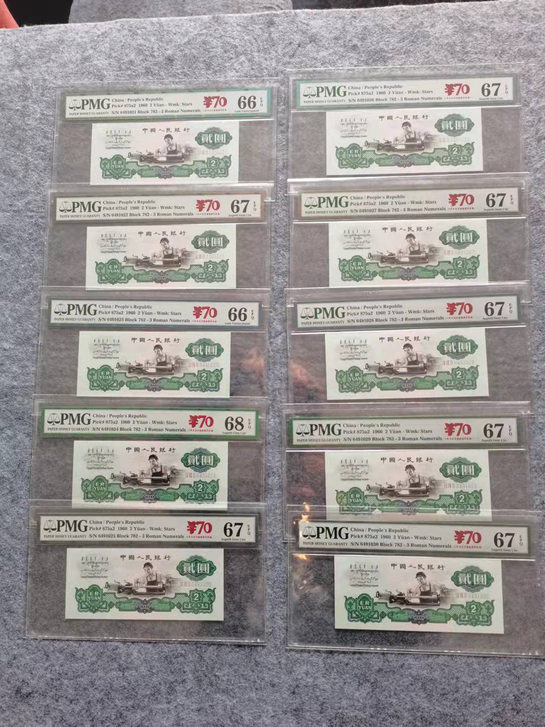 PMG双标车工标十连一组,中国人民银行70周年红标。66分2枚,67分7枚,68分1枚。售价38888。不常在线,电话联系确认为准!