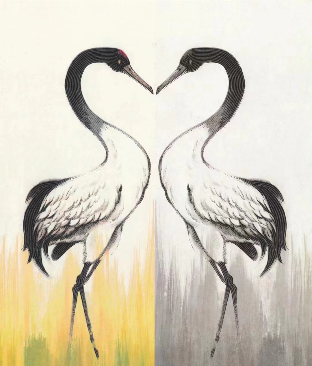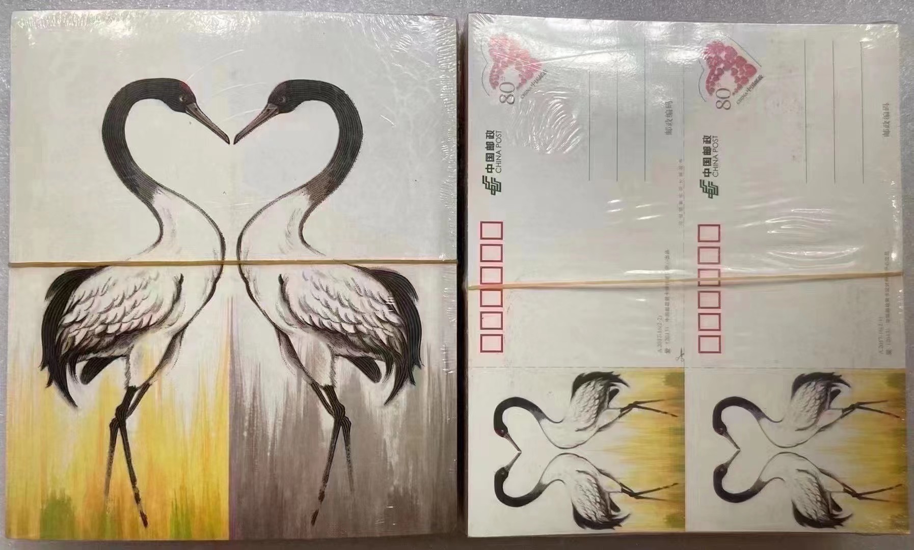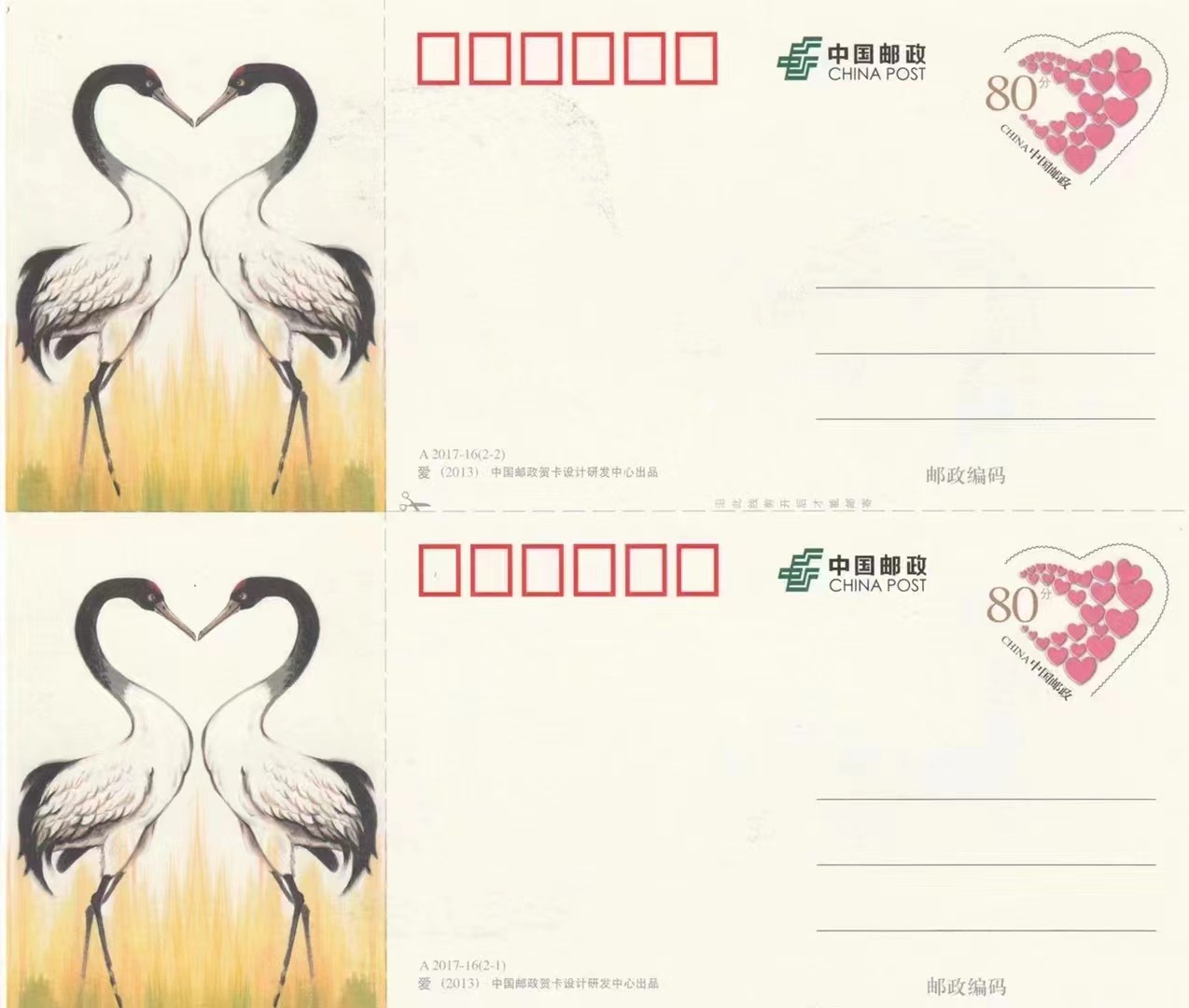 国版黑颈鹤雕刻版双联片,国版编号A2017-16,邮政贺卡设计研发中心出品,单色和多色雕刻工艺,两只黑颈鹤相互对视,头、颈、身体组成心形。7元/版,10版起卖包邮。可以提供原封100版。