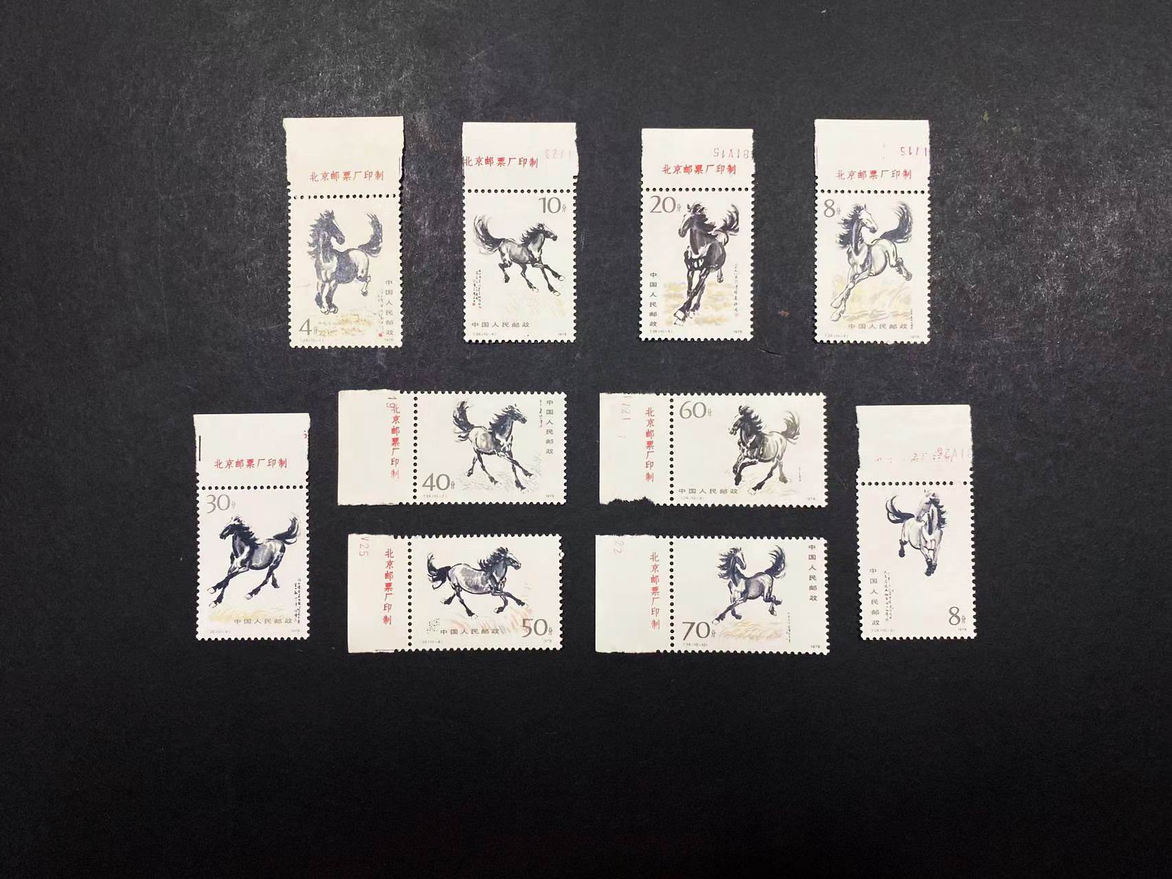 T28奔马带厂铭新全,10枚一套,票面颜色好,第3枚铭没有那么清楚,这不是关键票,背干净,没胶,上品,700/套