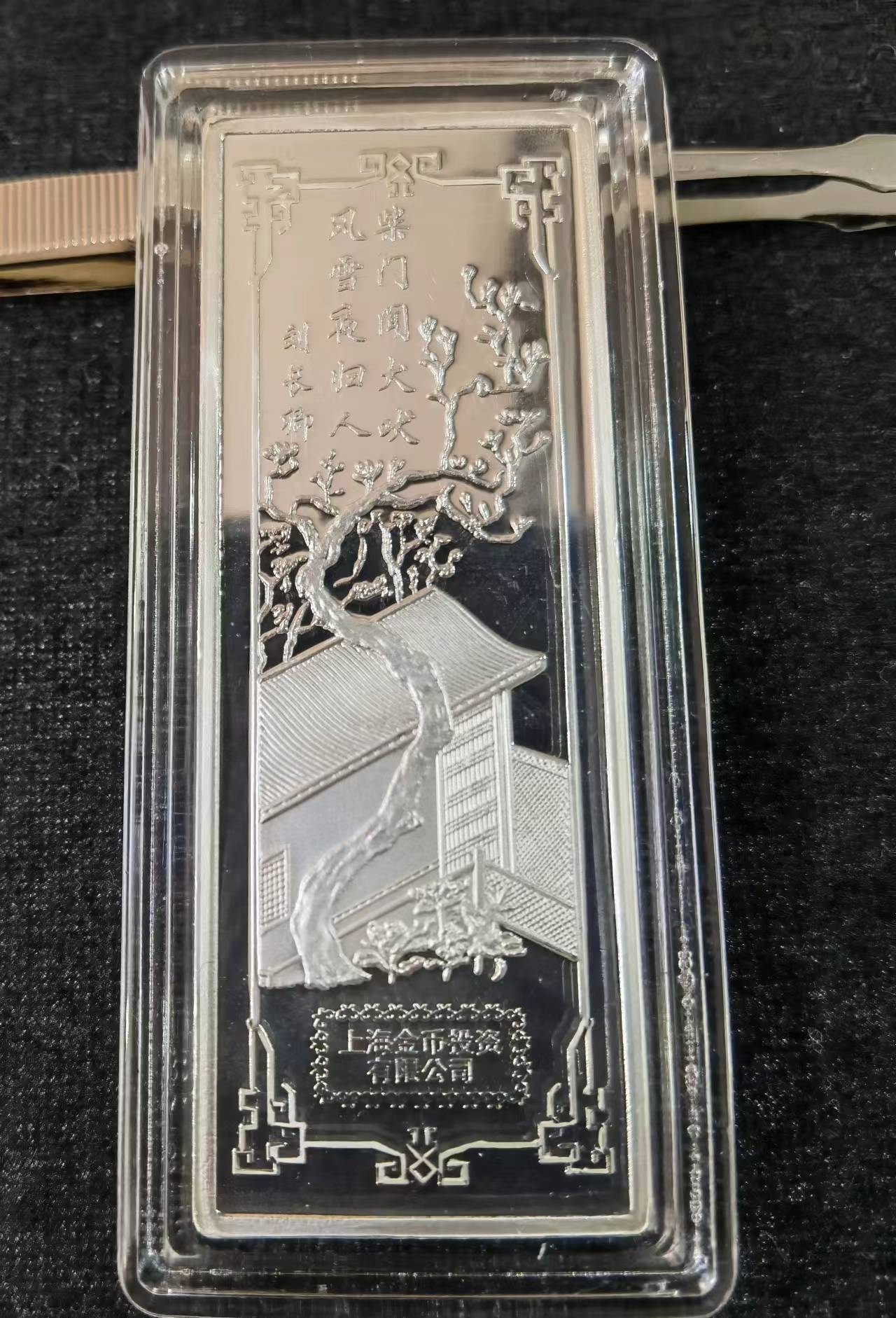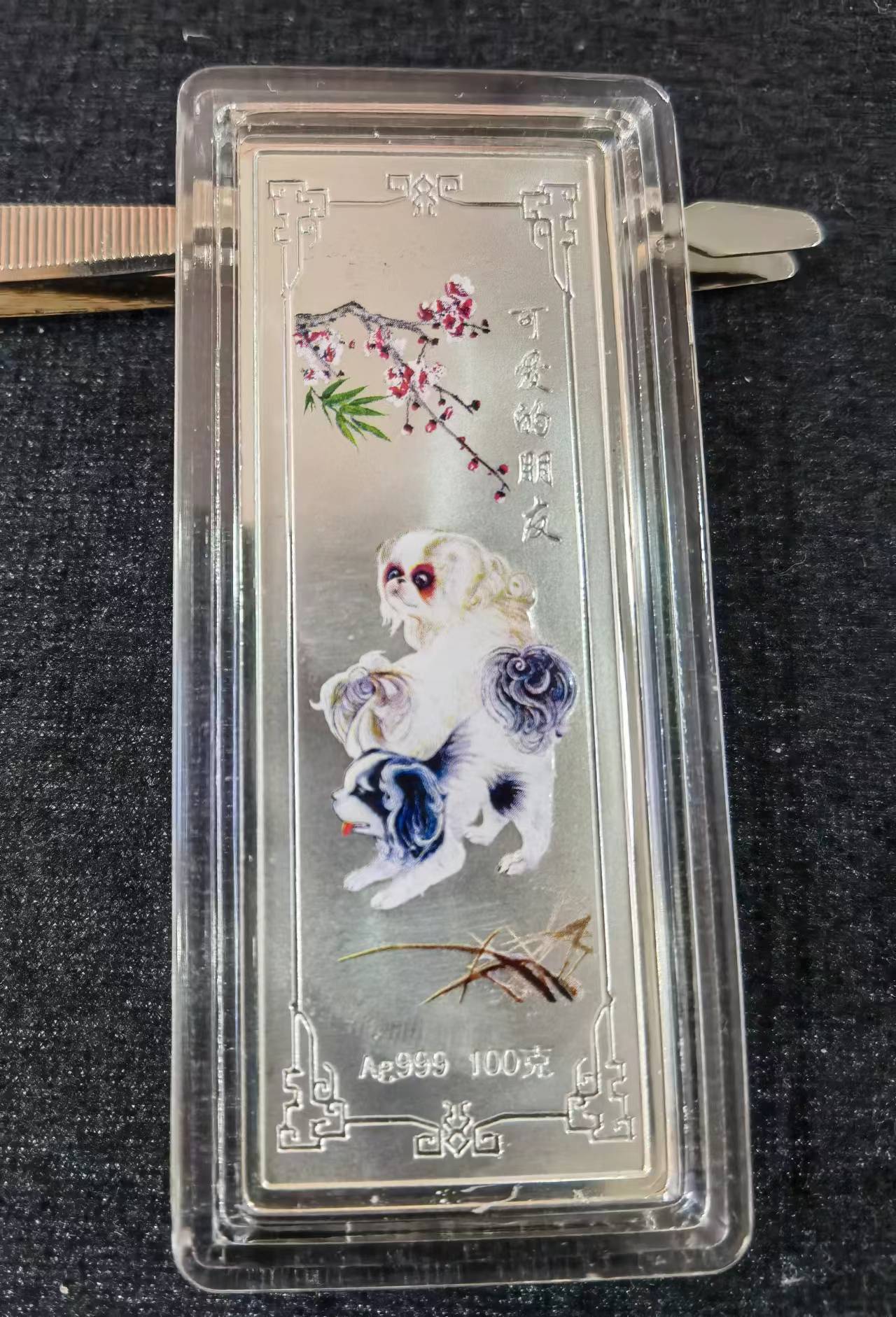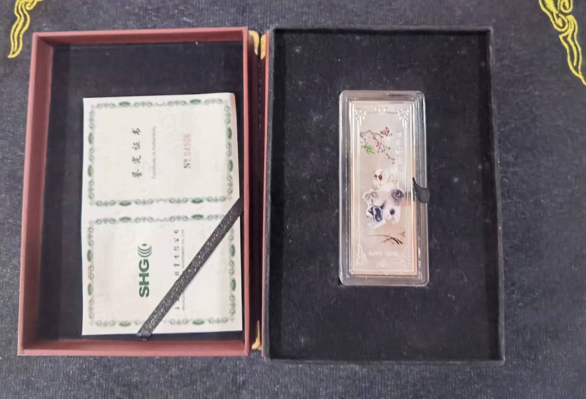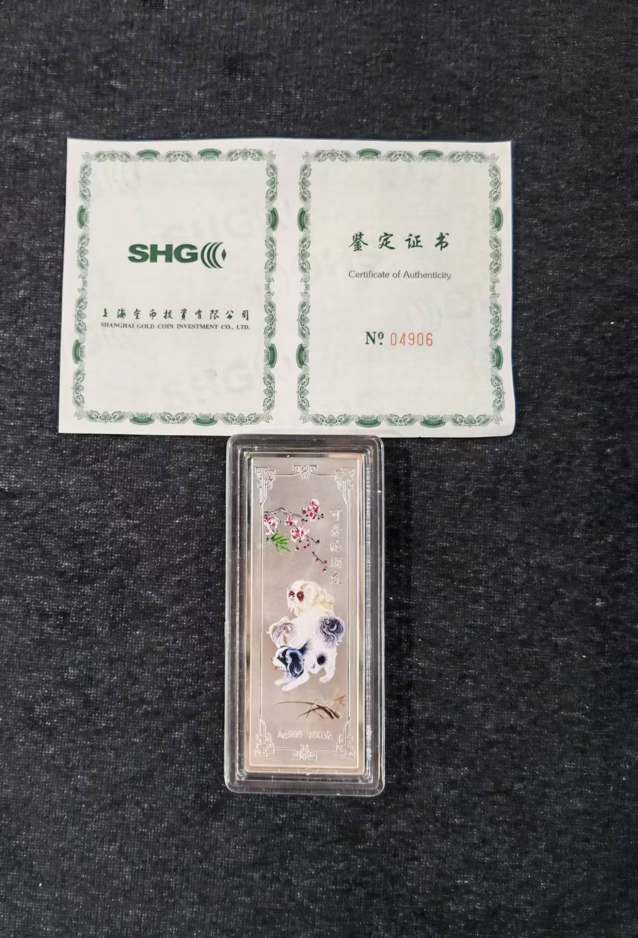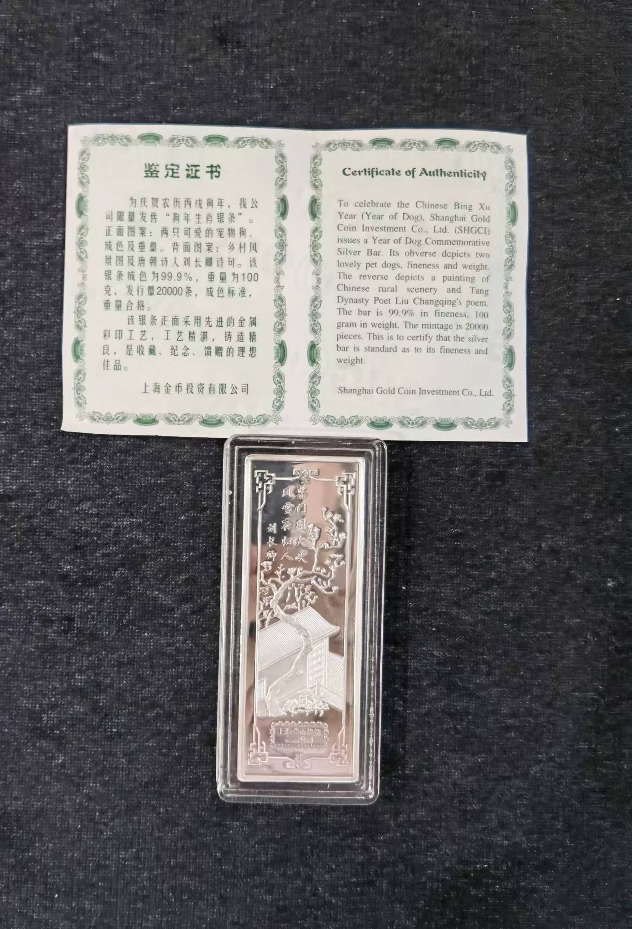 → 售:上海金币投资有限公司狗年100克贺岁银条一根,原盒证580元品相如图,多网同售电联确认