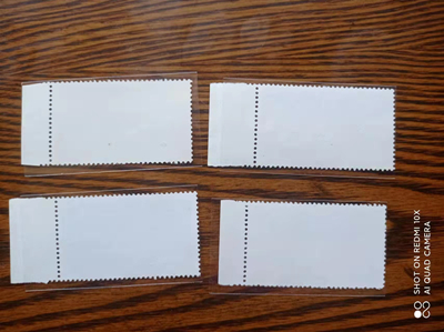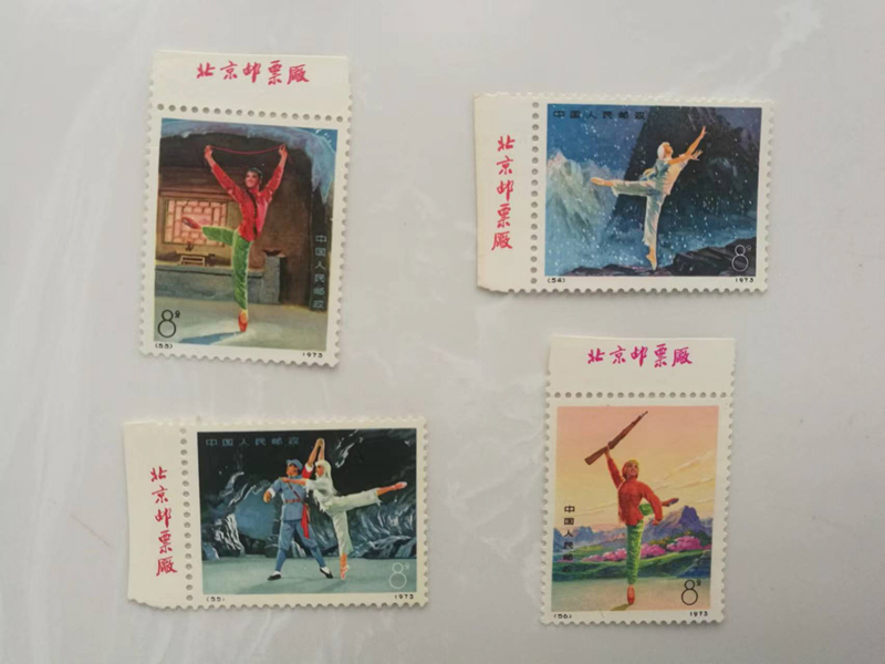 3、白毛女左上厂铭一套,边裁齿孔有折,个别有极轻微泛黄,800元。