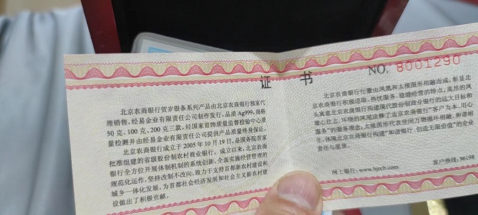 四五六图:广东宏大爆破300克银章1560.0,北京农商行50克马银条280.0
