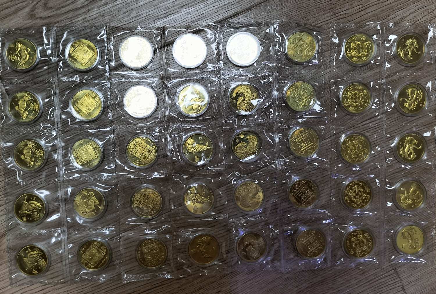 出沈阳造币厂原封整版纪念章8版,每版10枚,其中97年牛,98年虎,99年兔,05年鸡,06年狗(有一枚有绣),07年猪各1版,01年蛇2版,共计80枚,如图,一起1600包邮