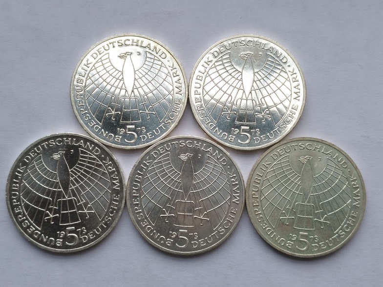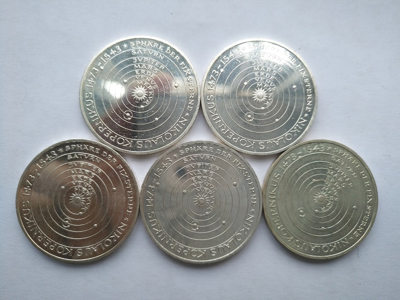 1973年西德纪念哥白尼5马克银币;5枚*68元=340元包挂!