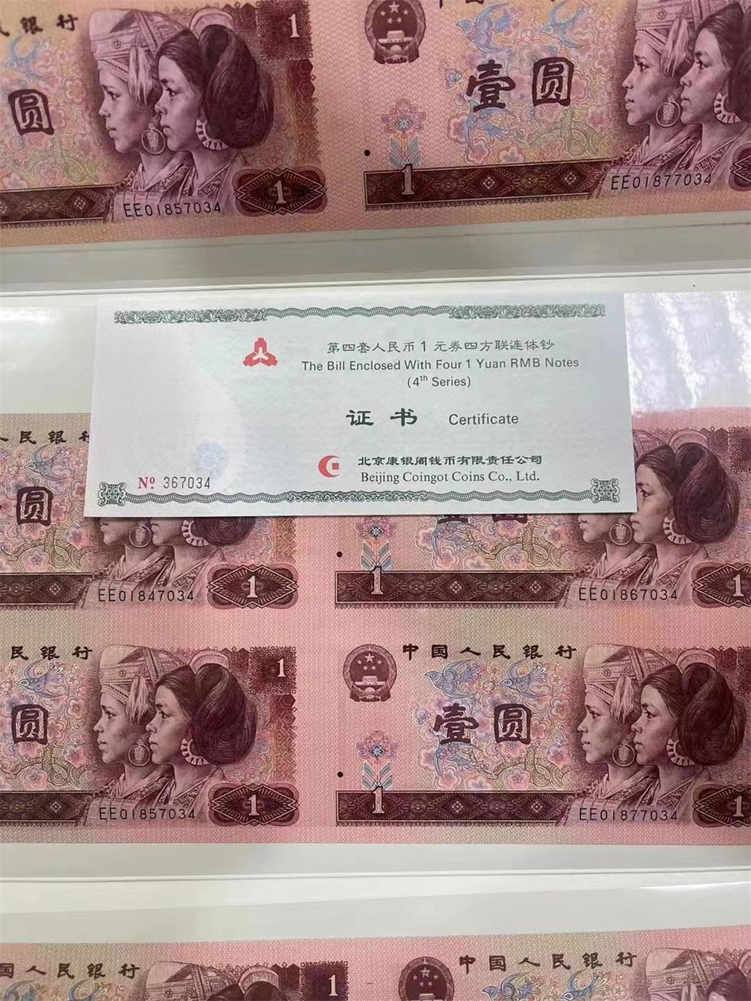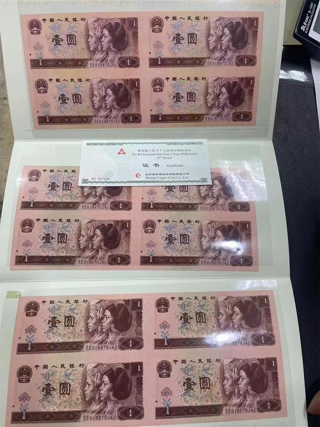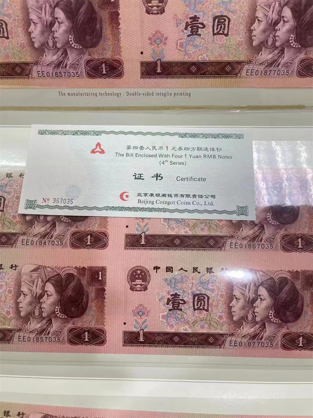四版一元四连体钞,全新肉眼绝.品证书对号,两本通走