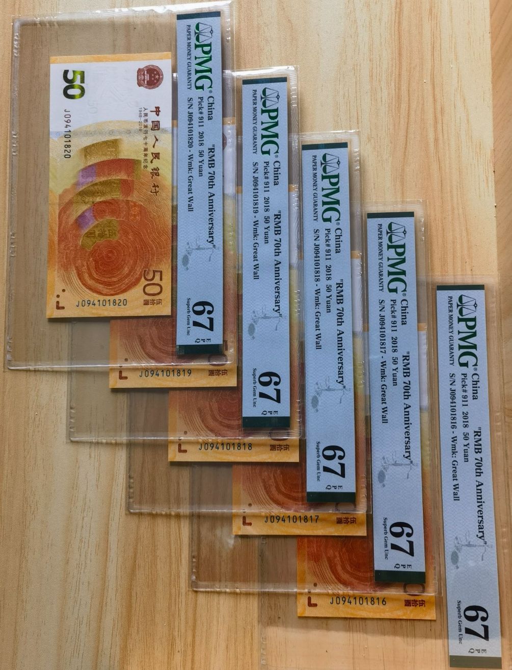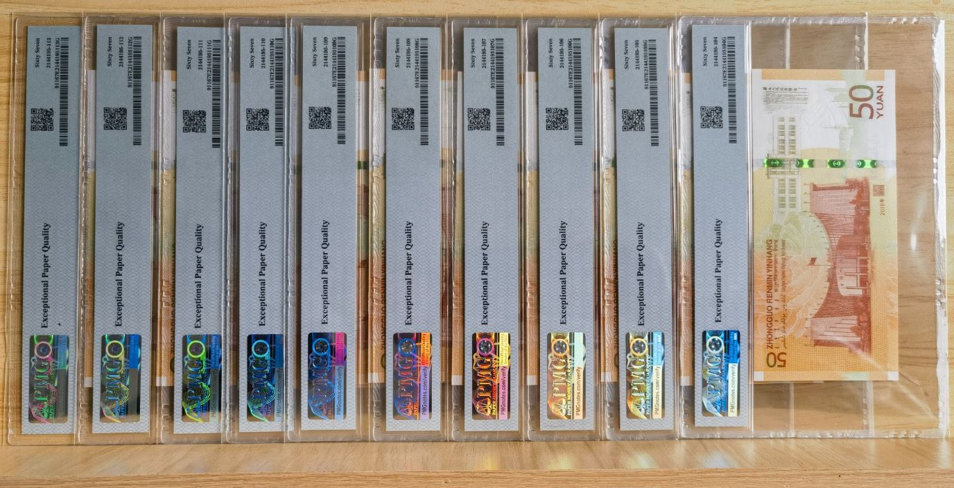 9800出70钞PMG67分评级币094标十一组,不还价,冠后好号中无3472569AB号1818,永葆青春,包顺丰。