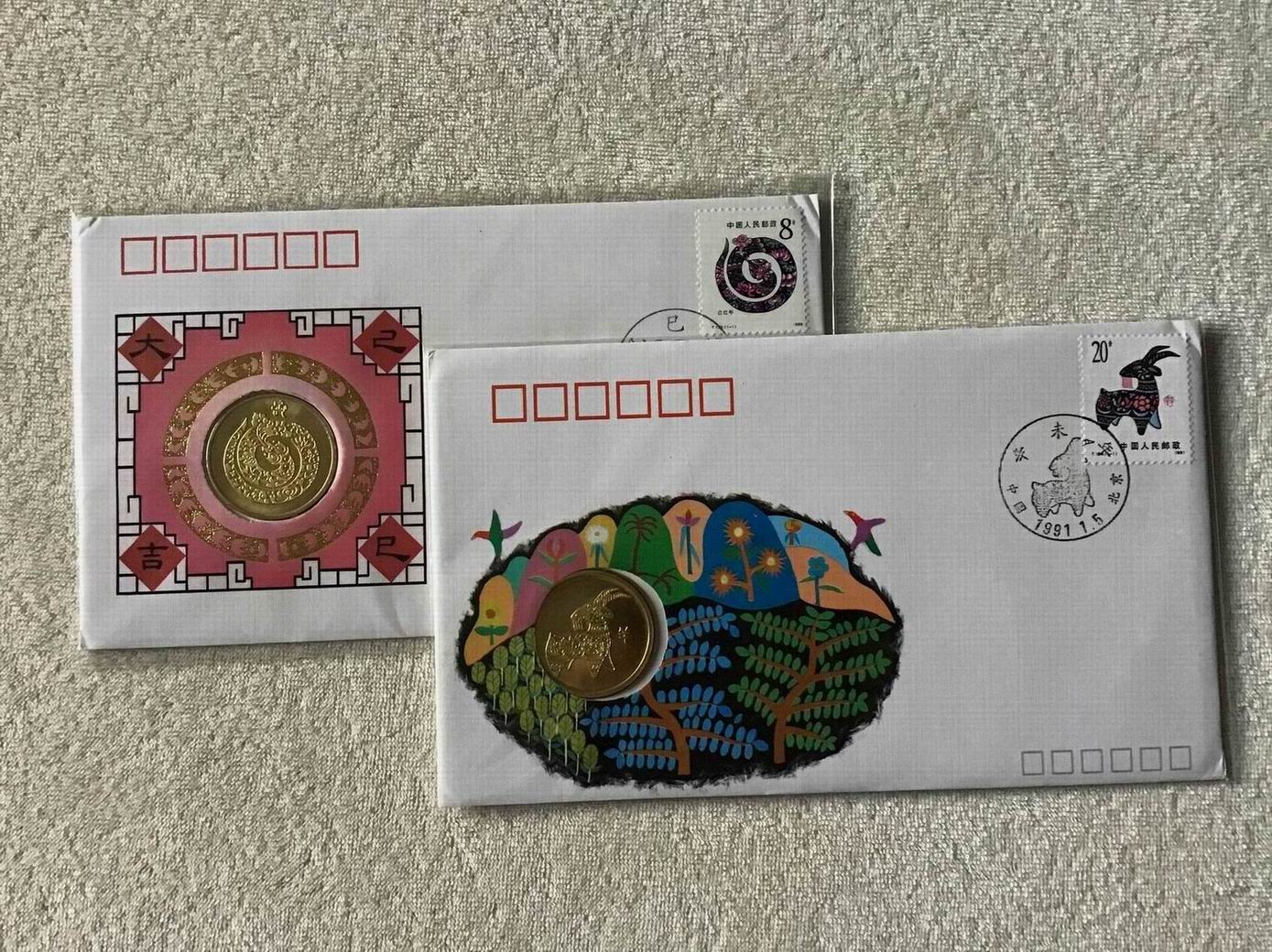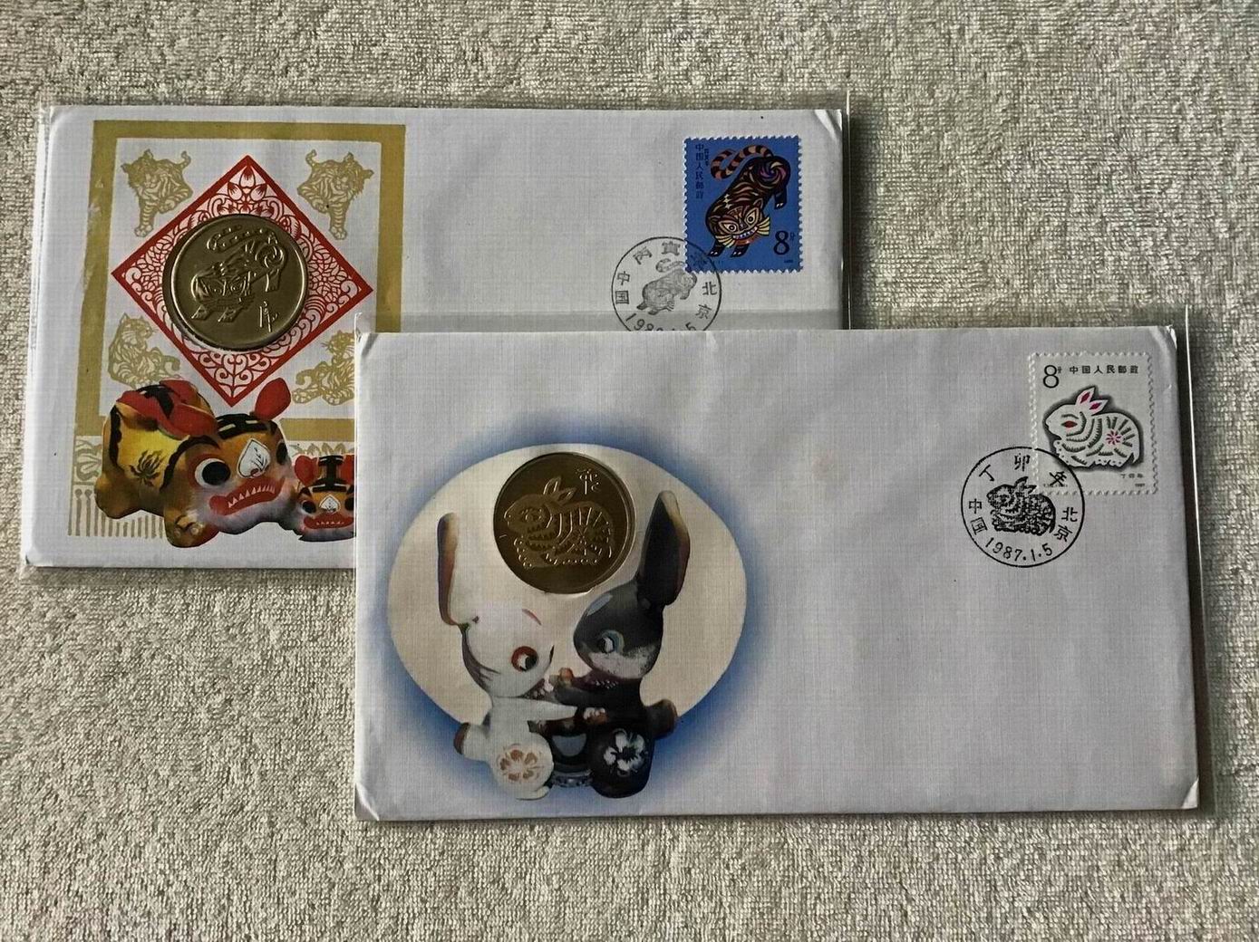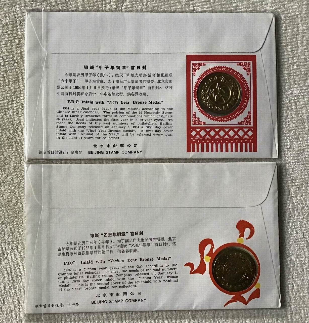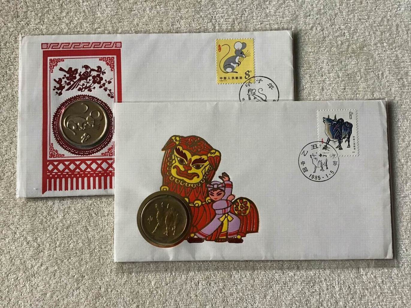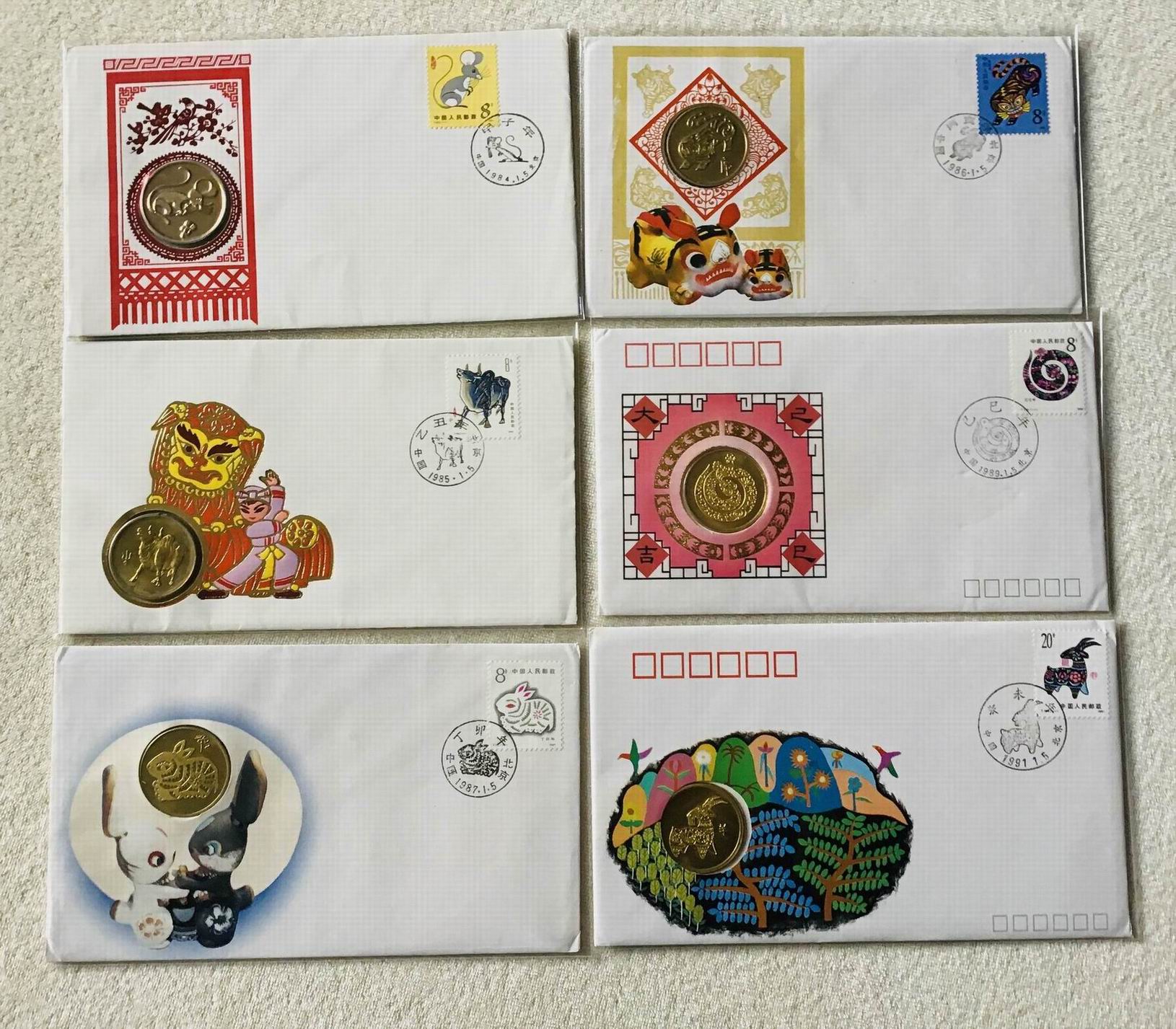 一共6枚鼠牛虎兔龙蛇羊(缺龙和马),这种封非常罕见,第一个从老鼠开始是因为老鼠属于天干地支第一属相六十甲子,第二个每个铜章正面图案和一轮生肖邮票一样,第三个都有邮票当日的邮戳,所以一轮生肖铜章龙头系列从老鼠开始一直到羊一共八种。
