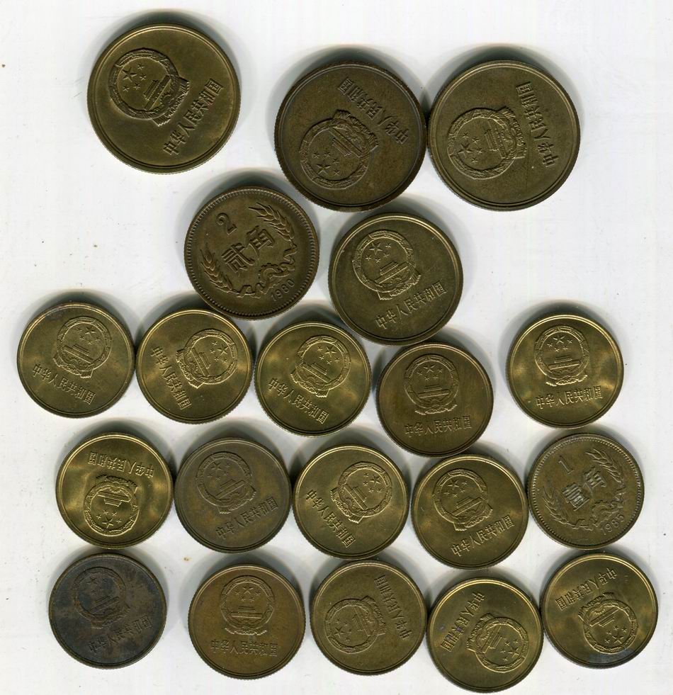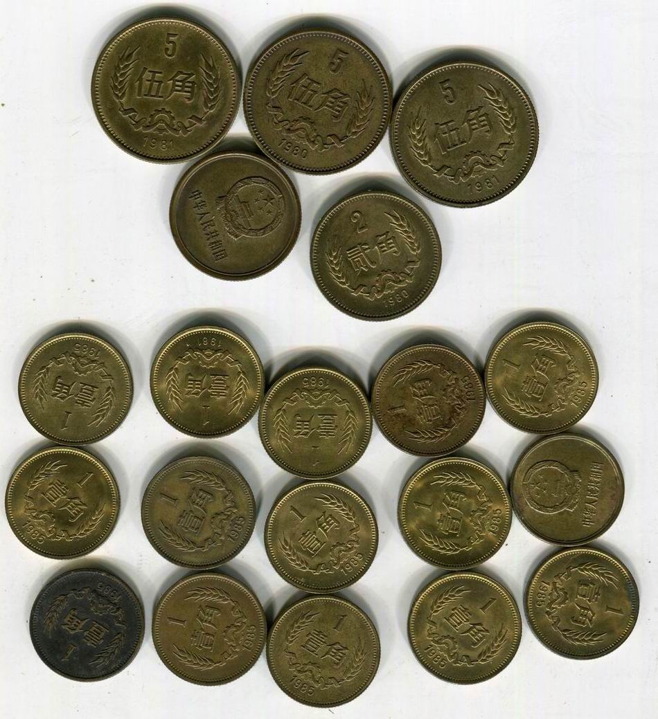 铜1,2,5角,带光,一角15枚,2角两枚,都是80的,5角三枚,有一枚80的,一起走610元,不议价,包顺丰