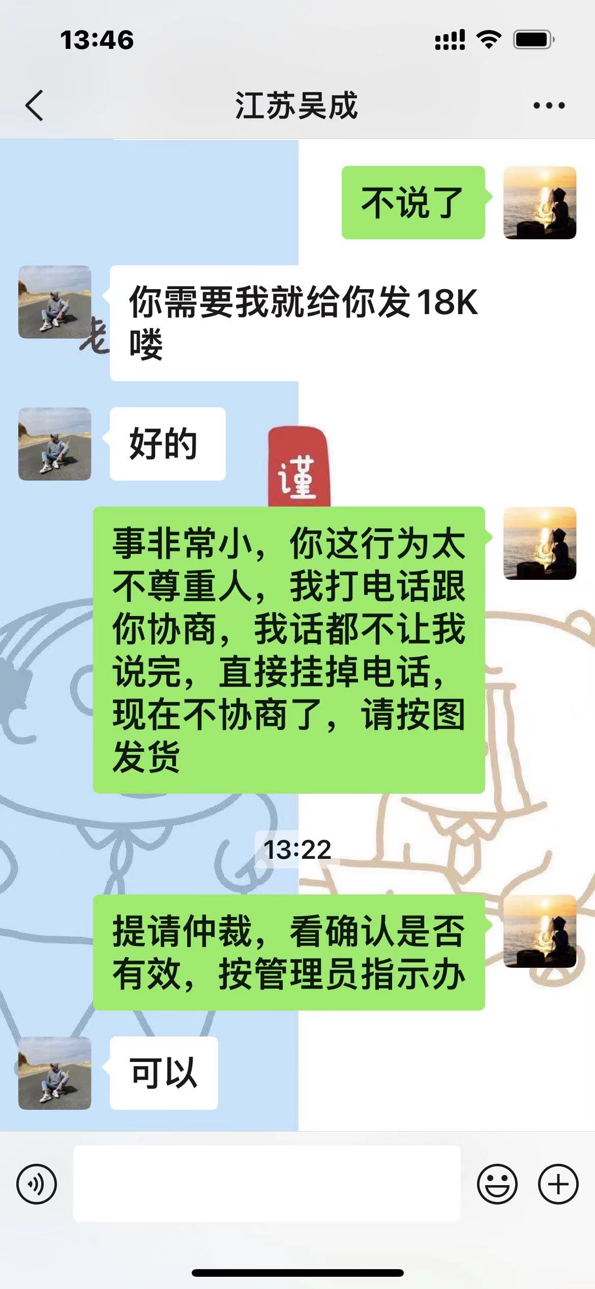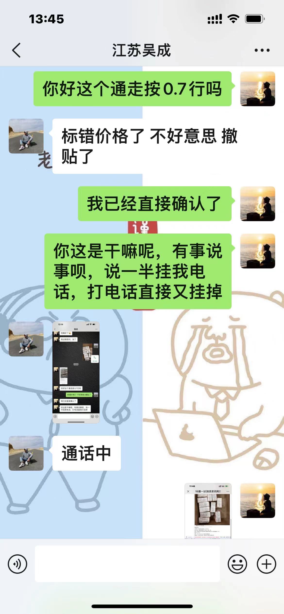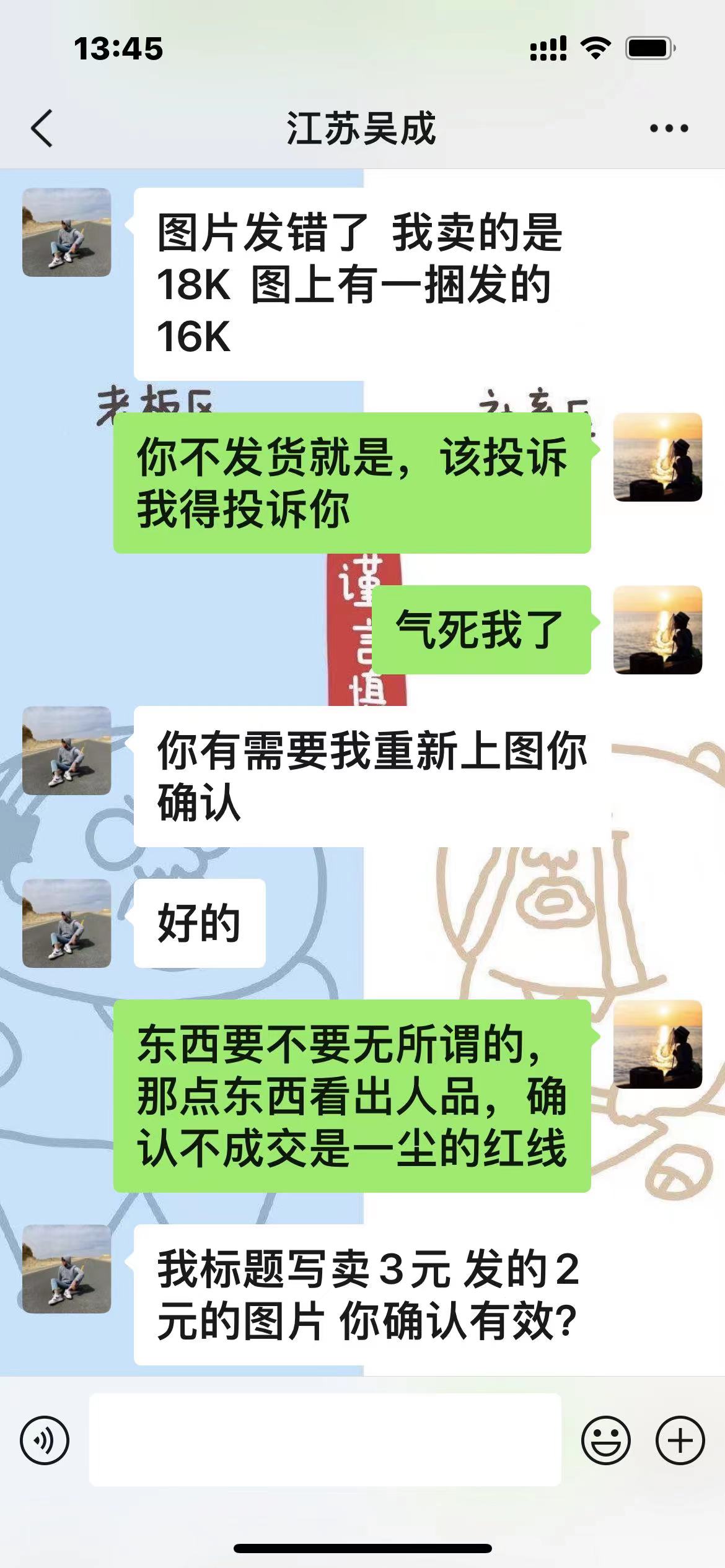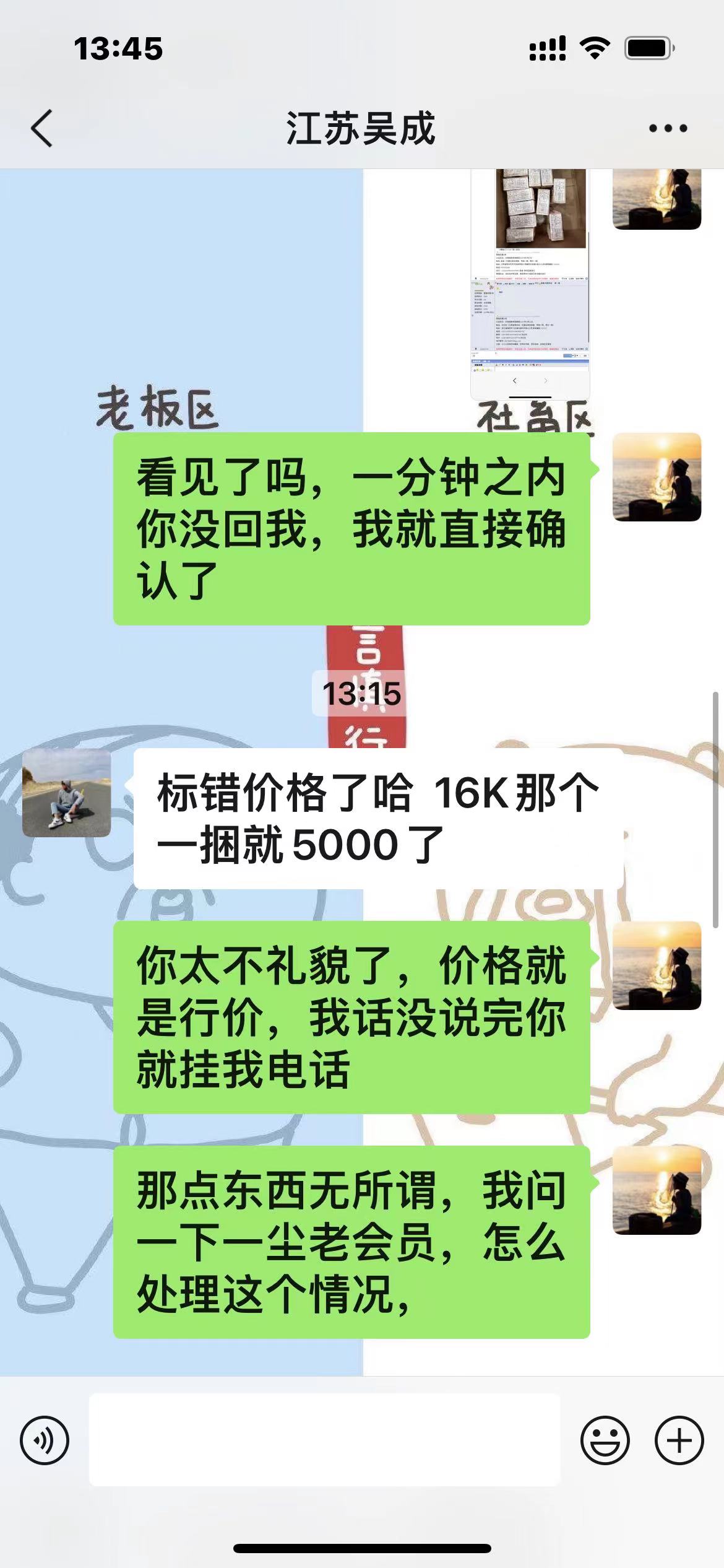 先微信询问是否可以优惠,对方没回我,我1分钟之内直接确认。打电话过去说一半对方直接挂电话,说挂错图了你确认无效。请问版主或者管理员仲裁我的确认是否有效,如果有效我投诉常州吴成确认不成交,劳驾网站仲裁。