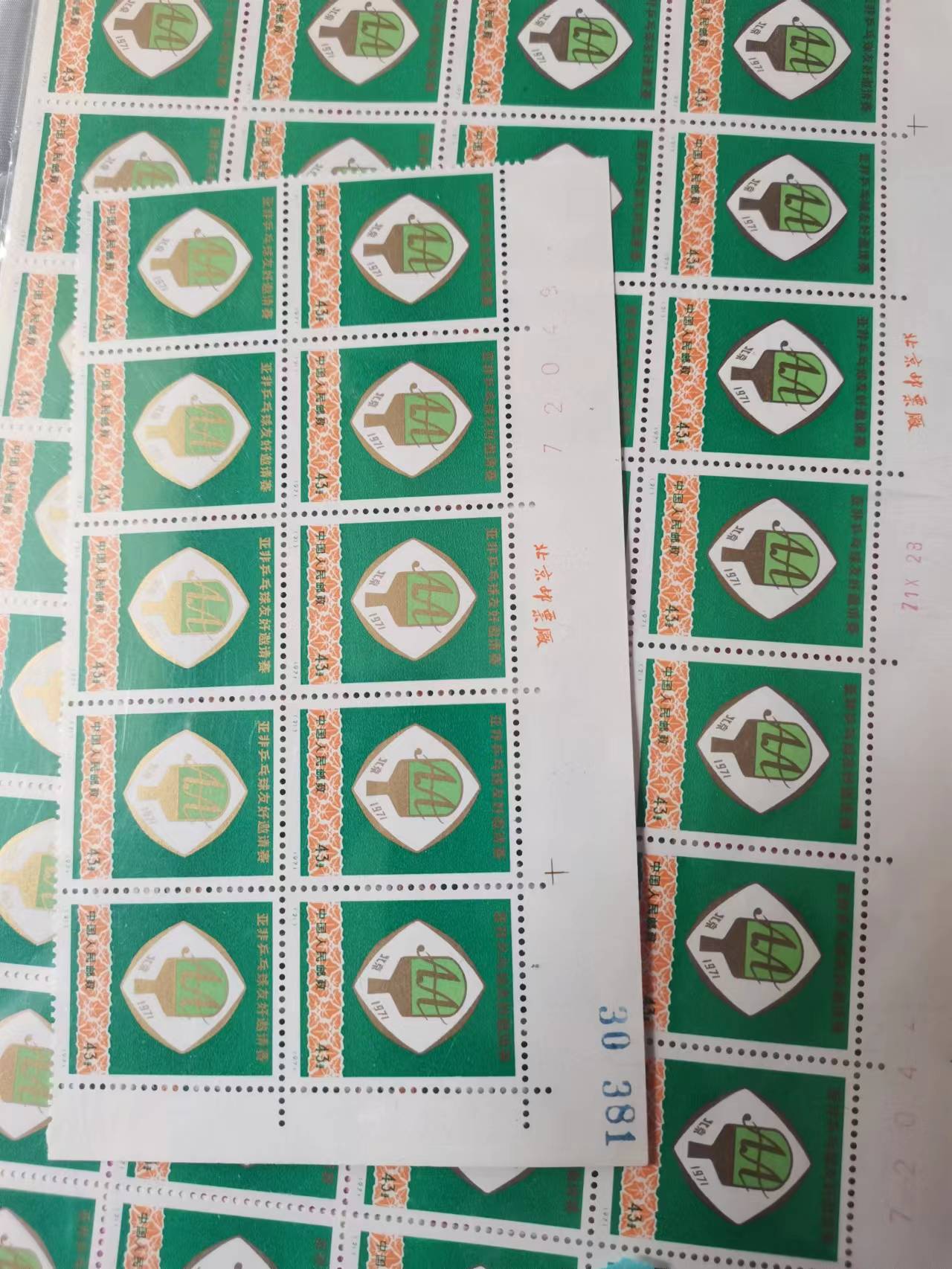 球一,21号票为一个40连和10连,其中有几枚有极轻微轻微微黄,其余为版票,齿间极轻微软印,基本看不出,22号票3-4枚票有红圈内一处测光才能看的出的痕迹(应该是鼻涕胶),23号边纸一处破损,版票有极轻微软印,影响不大,其余版票都无黄,作为上品单套卖,!金粉好!420一套!要求苛刻,要求评级品相