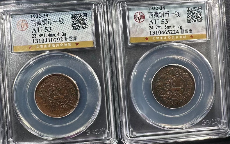 → 2枚西藏铜币 新雪康 一钱,公博53分《0792一5224》