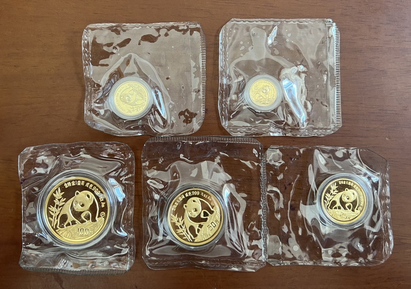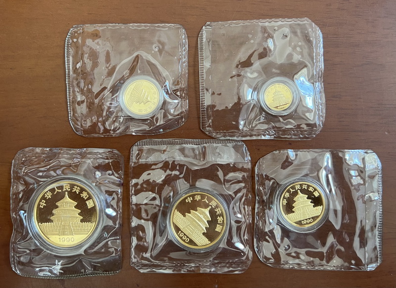90熊猫金币全套5枚,精制P版,原封,仅铸5000套,实物如图,售35500元