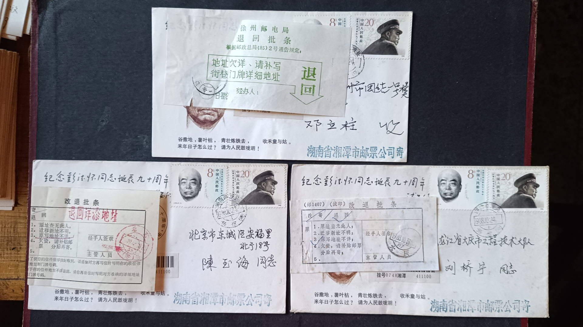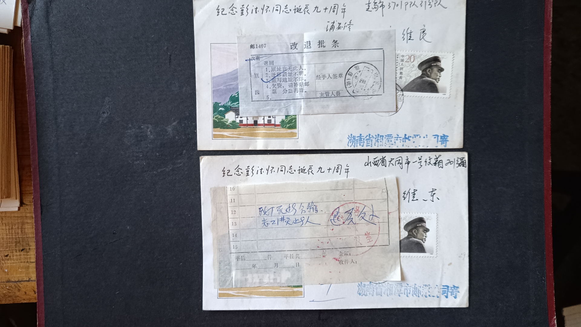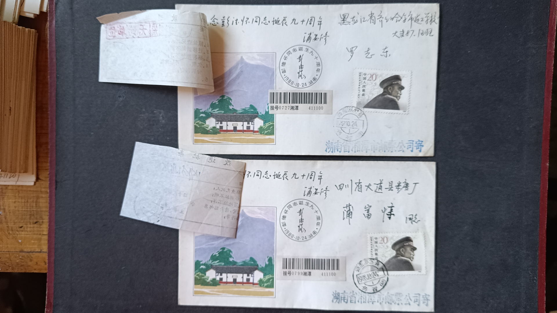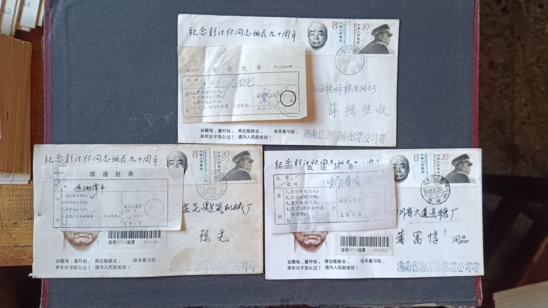 1988年彭德怀诞辰九十周年原地首日实寄封(贴改退批条)--2 ,封正面盖黑色纪念戳,发戳和落地戳都清楚,45元一个,有9个,挂号5元,随机发货,如图所示,所见既使得。