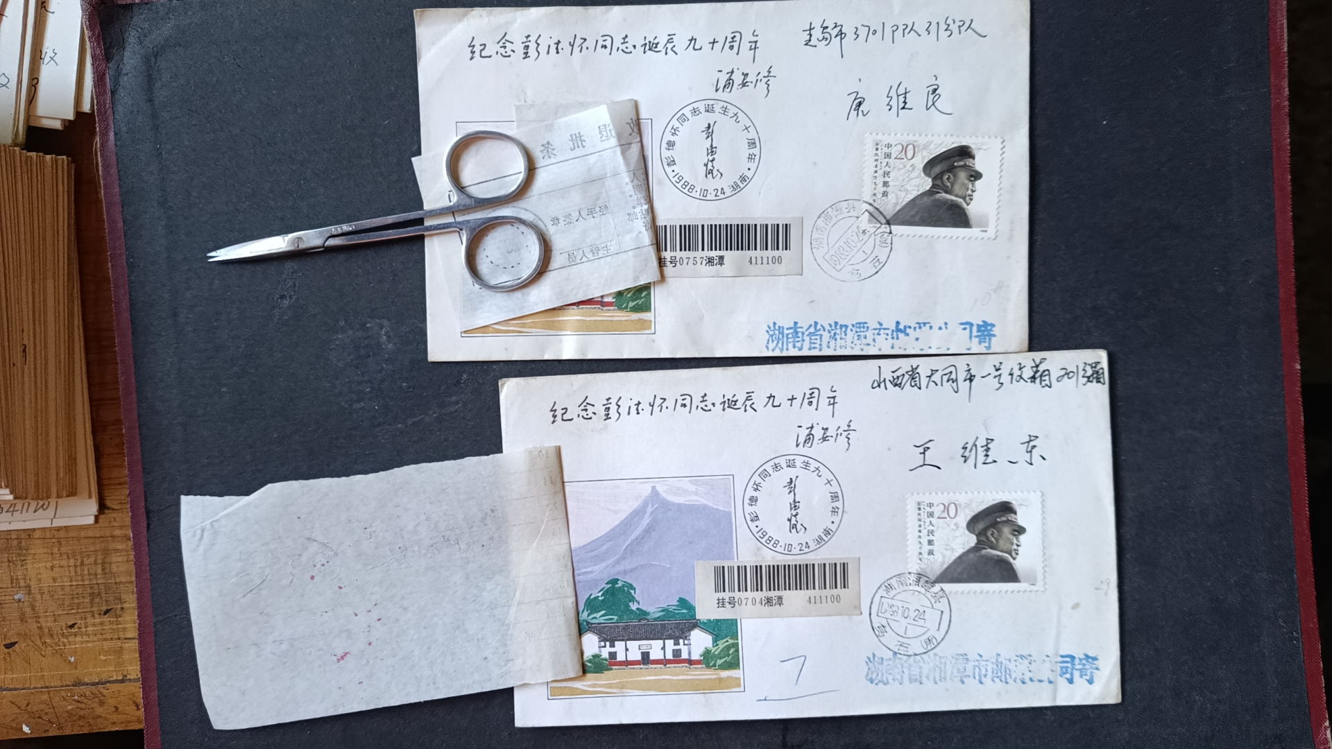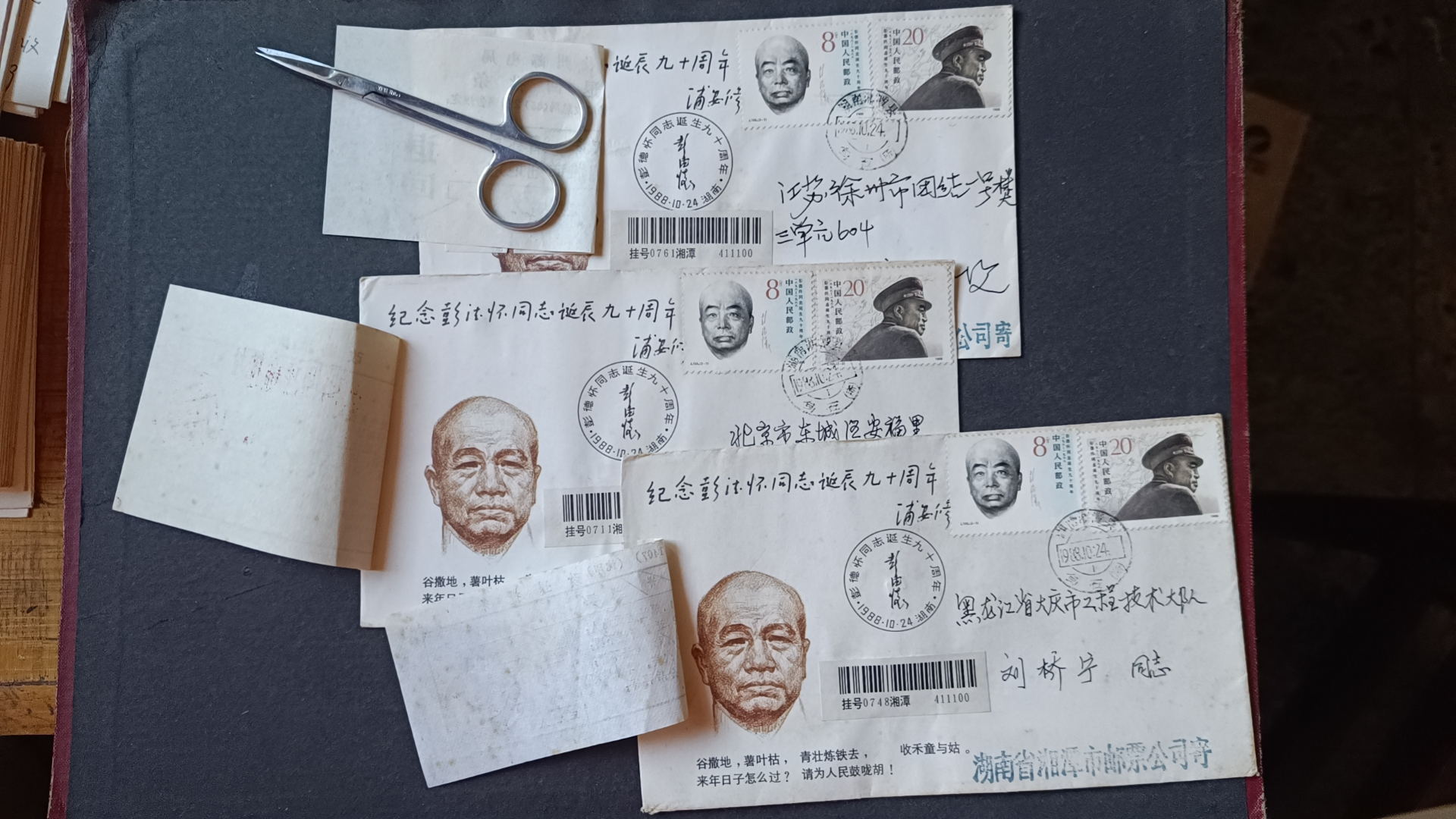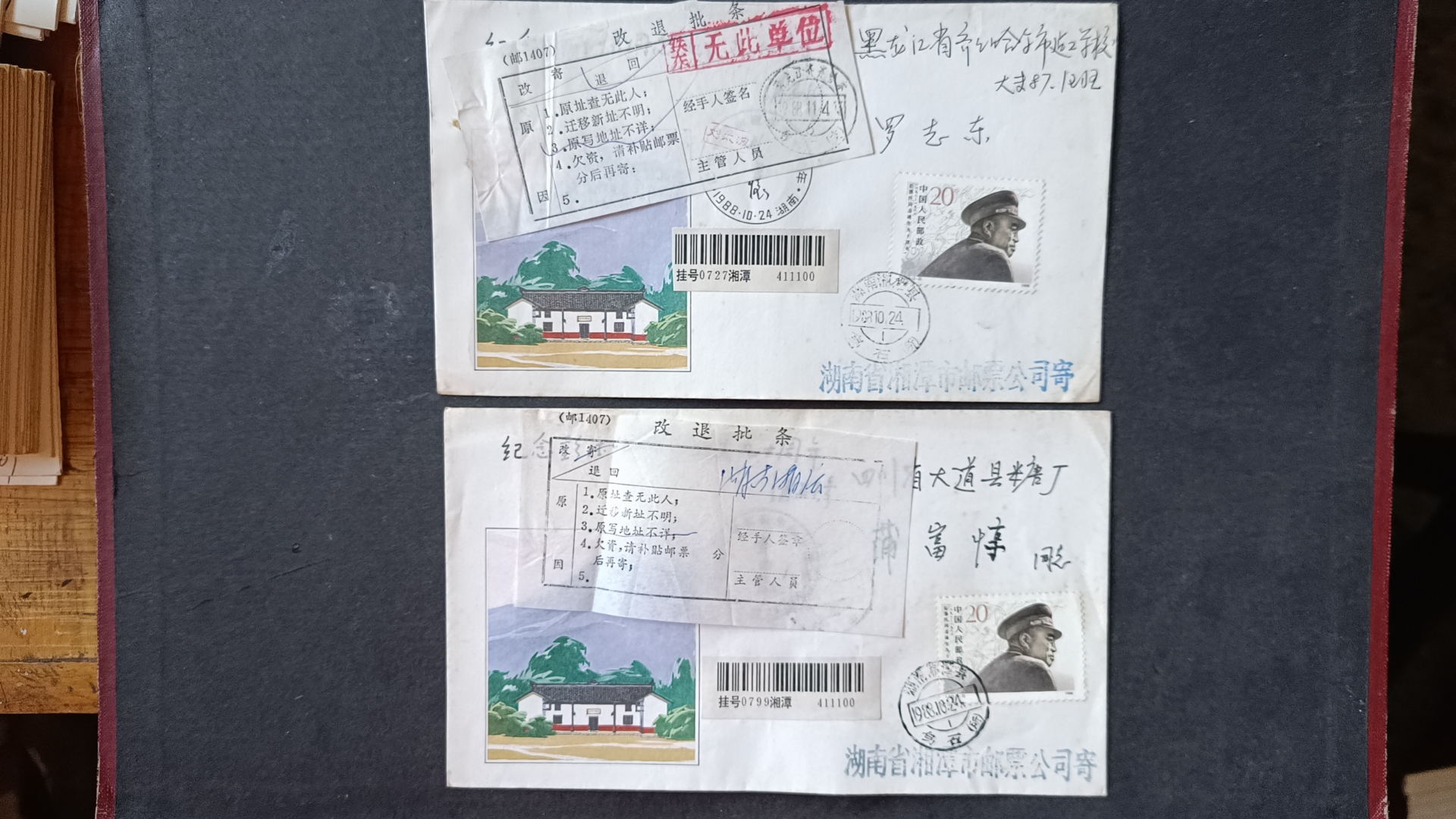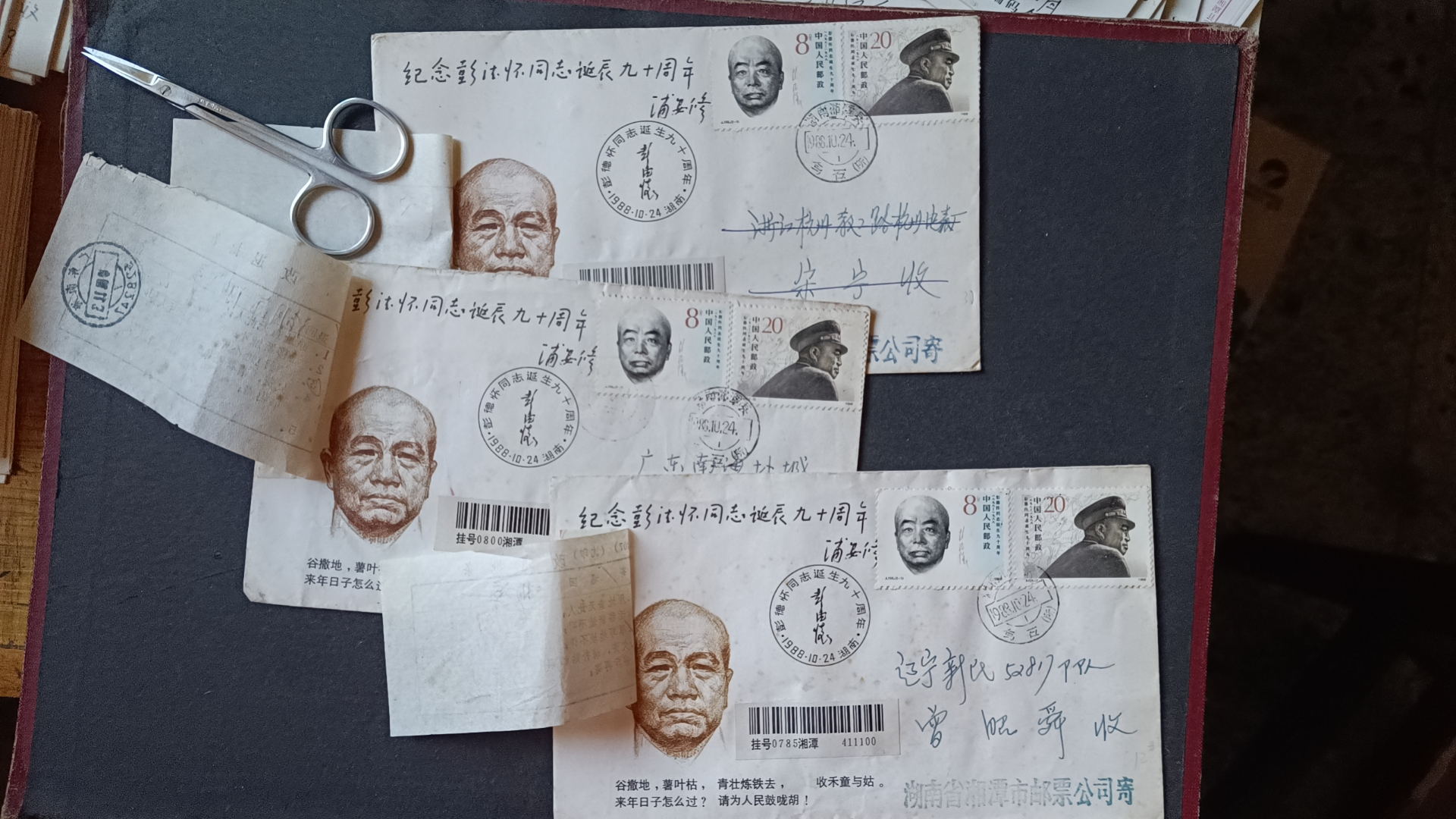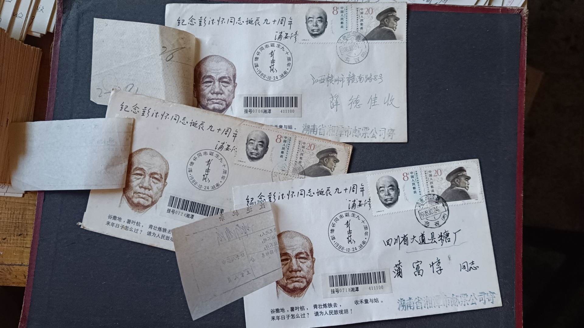 1988年彭德怀诞辰九十周年原地首日实寄封(贴改退批条)--2 ,封正面盖黑色纪念戳,发戳和落地戳都清楚,45元一个,有9个,挂号5元,随机发货,如图所示,所见既使得。