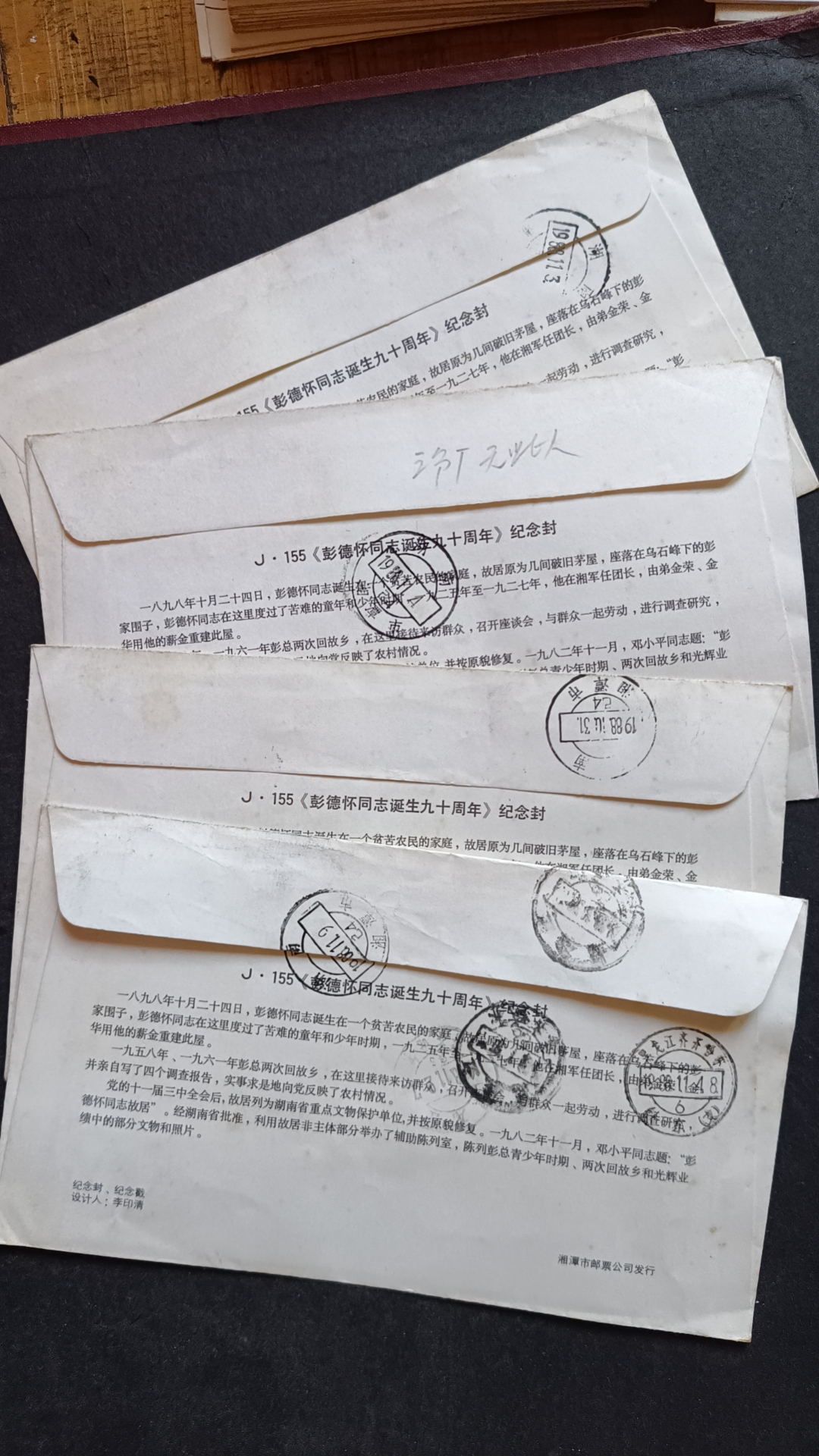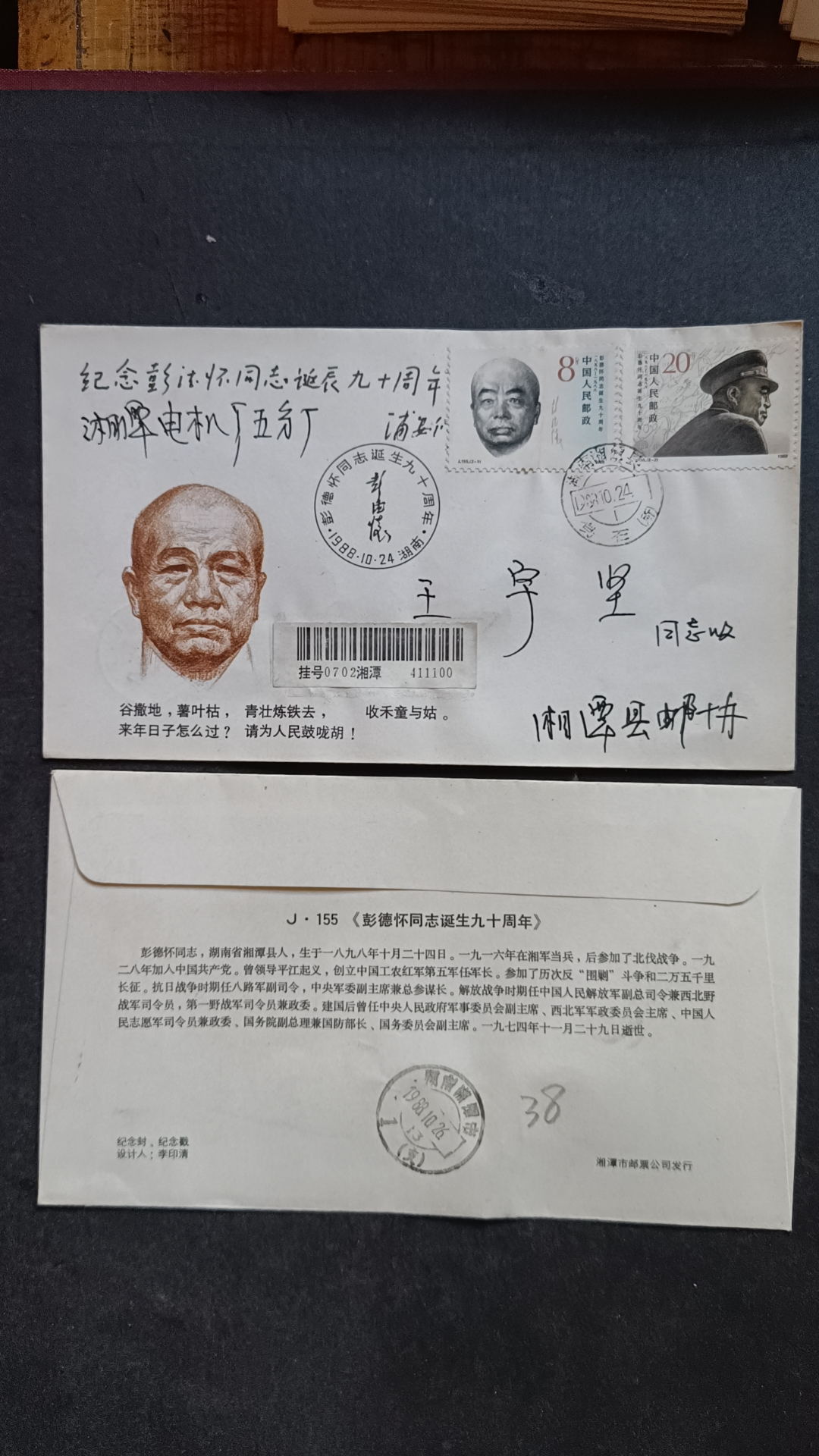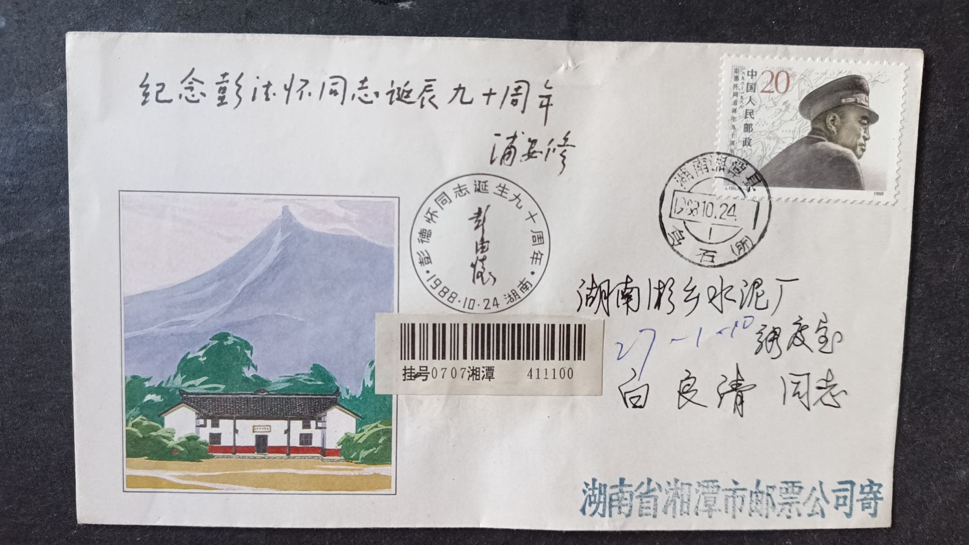 1988年彭德怀诞辰九十周年原地首日实寄封(第二枚票) ,封正面盖黑色纪念戳,发戳清楚,落地戳无,25元,挂号5元,所见既使得。