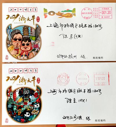 → =《出售》浙江牛年邮资机戳实寄封2套