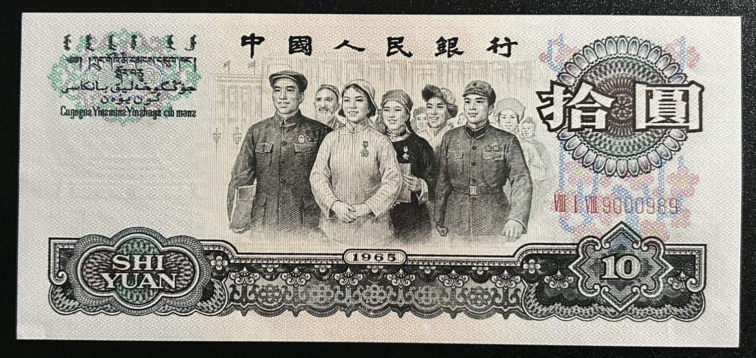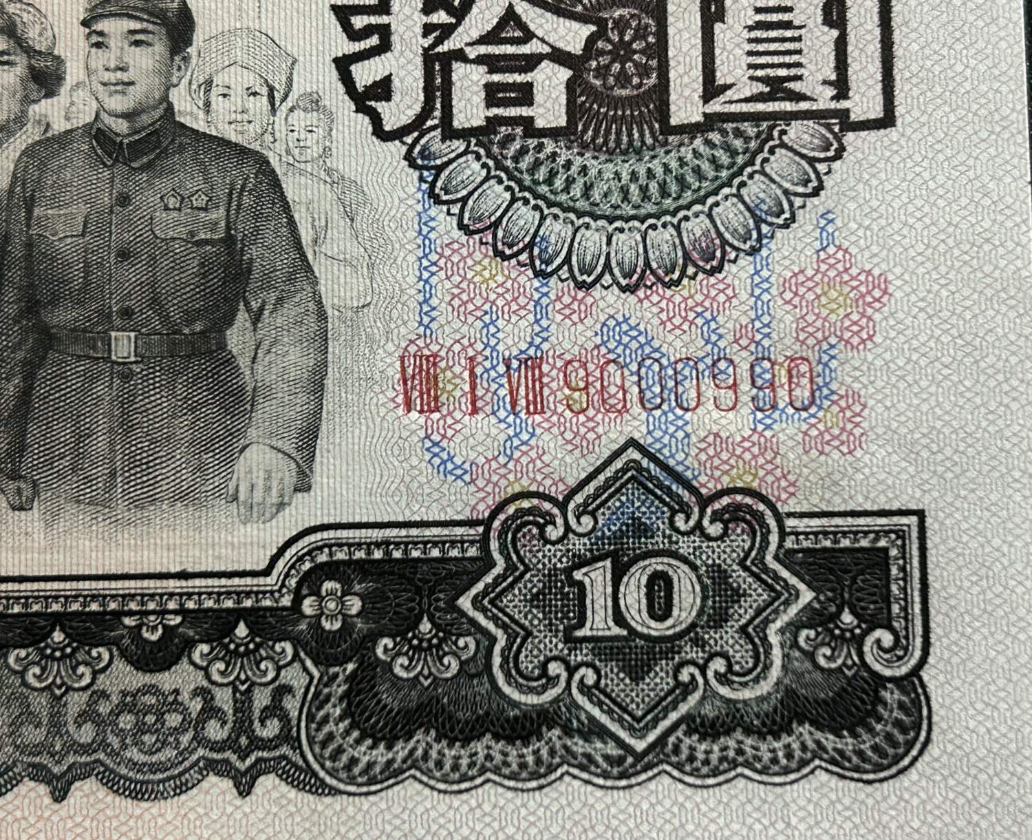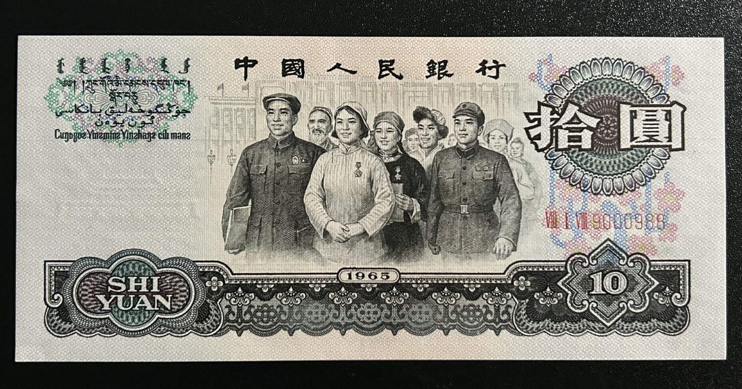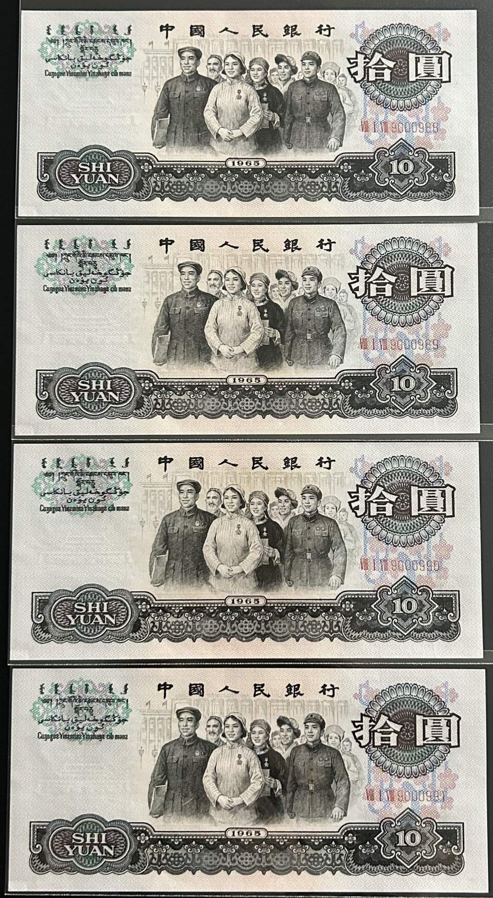 大团结四连号,号码:三罗818~9000988-9000989-9000990-9000991,全倒置号,连冠号都是倒置的,含人二9000990和9000988超级好号,刀拆原票,肉眼绝中绝,凹凸感强烈,票面有轻微指甲痕,可惜灯下有斑