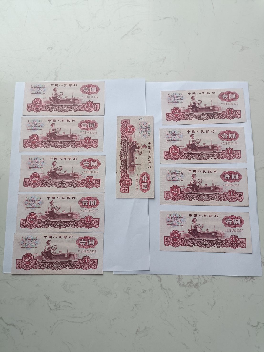 如图十连号,都是原票号码无47豹子号有写钢笔字软折,对光无黑线售价8000元,哪里看不明白可以微信看图