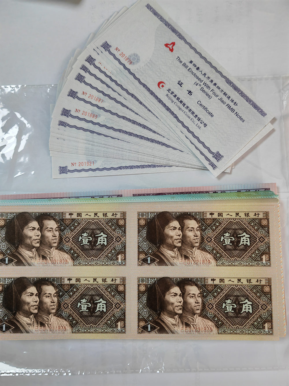 角币四连体42连号(断了888尾),全程无47(除了第一套1879带7),有些2角上侧带点油,1350元一套