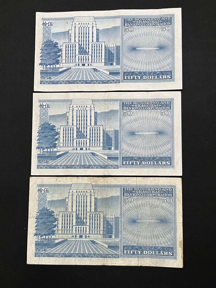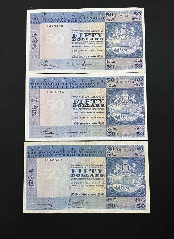出售早期香港汇丰银行纸币.品像如图.汇丰银行1981年.1983年50元(95元X3张=285元).汇丰银行1941年10元.5元(65元X2张=130元).共415元包快递.以电话确认为准.款到发货.