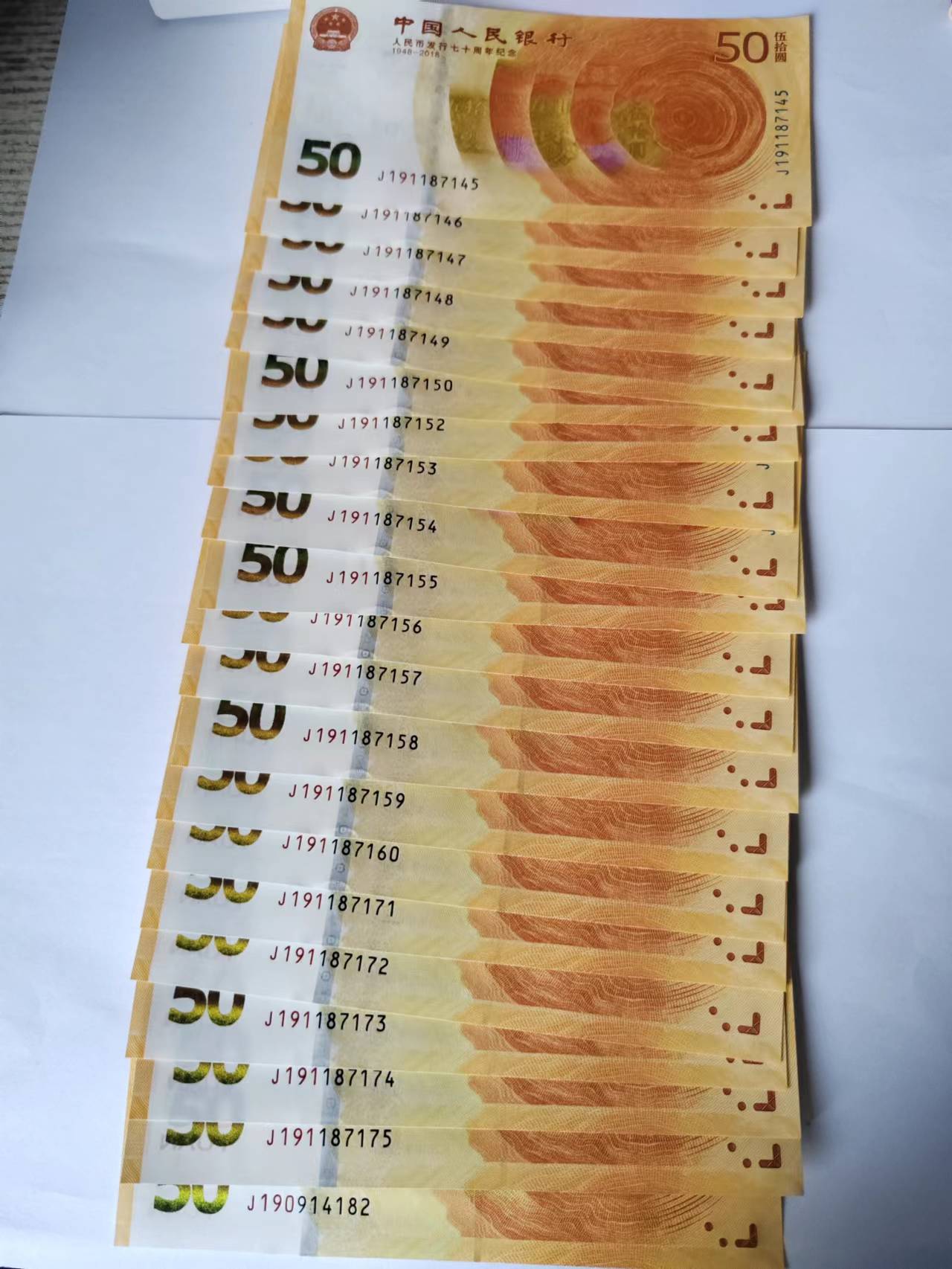 建国大小连11张218元每张,无4标十1组2350。无347标十2组20连5300元。品如详图。70钞补号21张,补号标十1组,散连和年份号10张,共41张,通走65元每张。