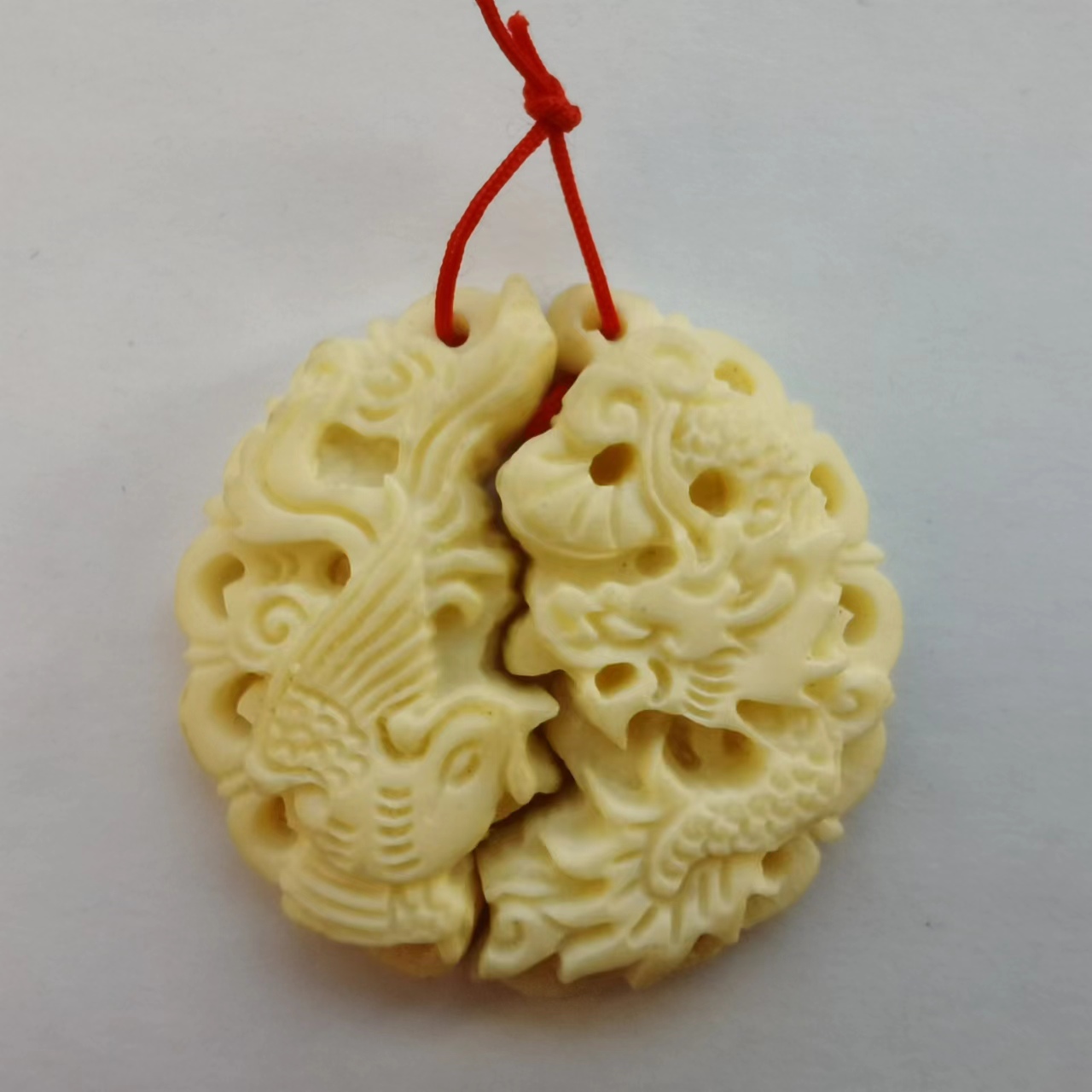 骨雕工艺品,龙凤呈祥寓意好,是现代的,很漂亮,送情人不错,直径42mm,厚8mm。68元包快递。