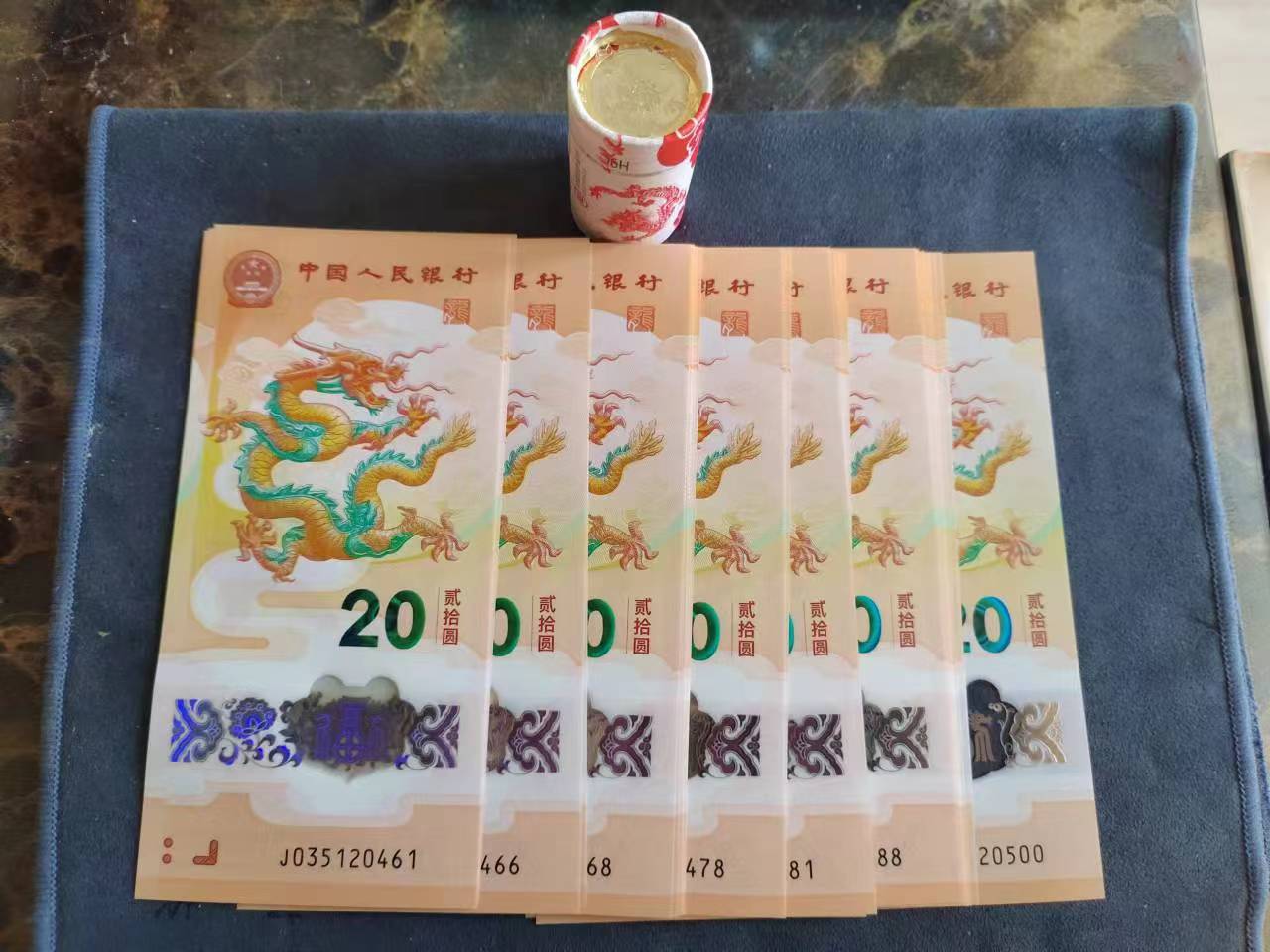 小龙钞J035120461-J035120500售39元每张,二龙币一卷无字无裂售15元每枚一起包顺丰今天发货。图片传不上去,可微信看图。