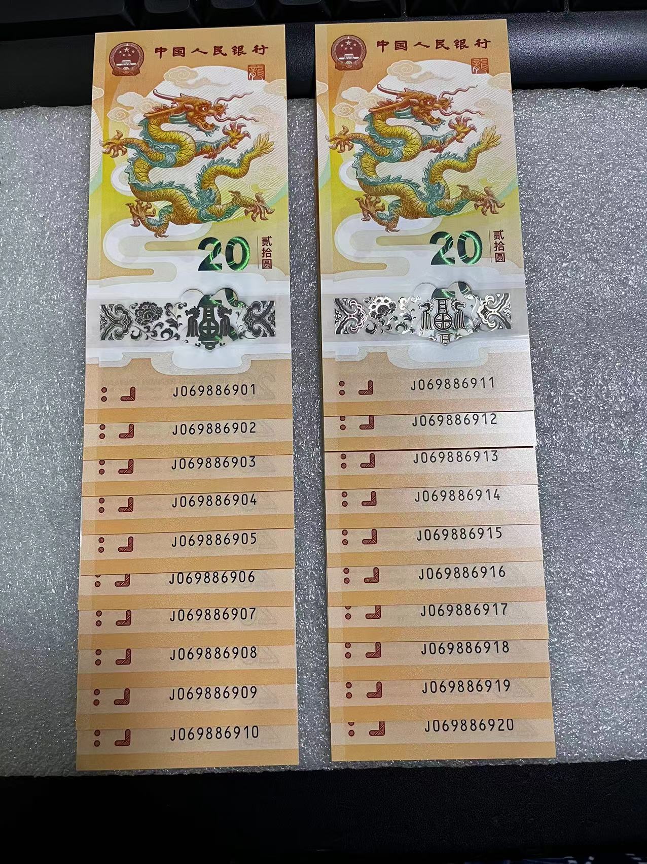 小龙钞,J069886901-----J069886920,圆圆号、倒置号、五福号、倒置圆圆号