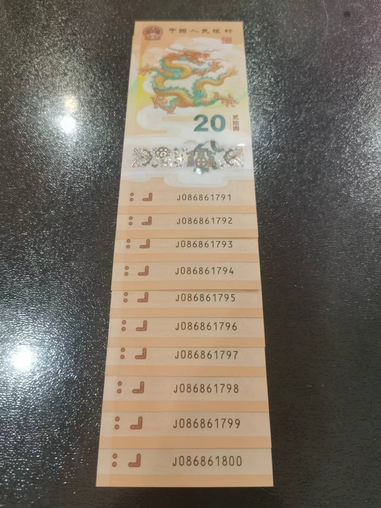 贺岁龙钞金钩倒置086861791—086861800倒置加95至尊号码:086861791—086861800(最后一张倒置)售价:2188元