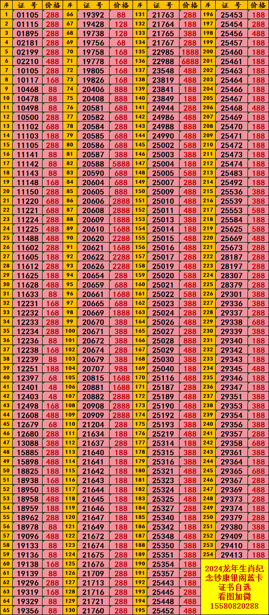 → 小龙钞康银阁蓝卡证书号码任选低至48/枚起