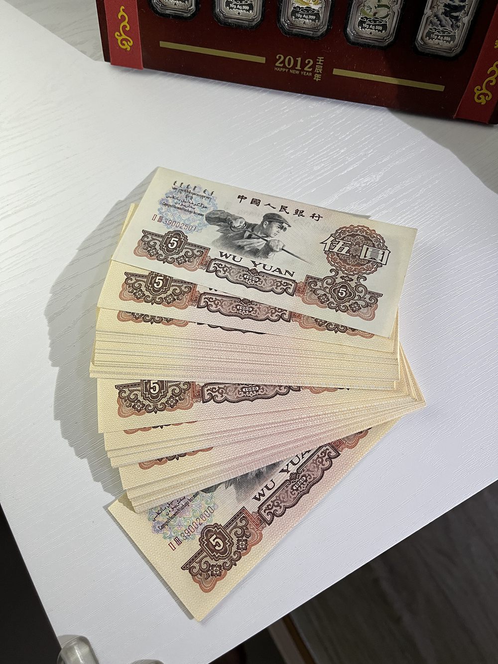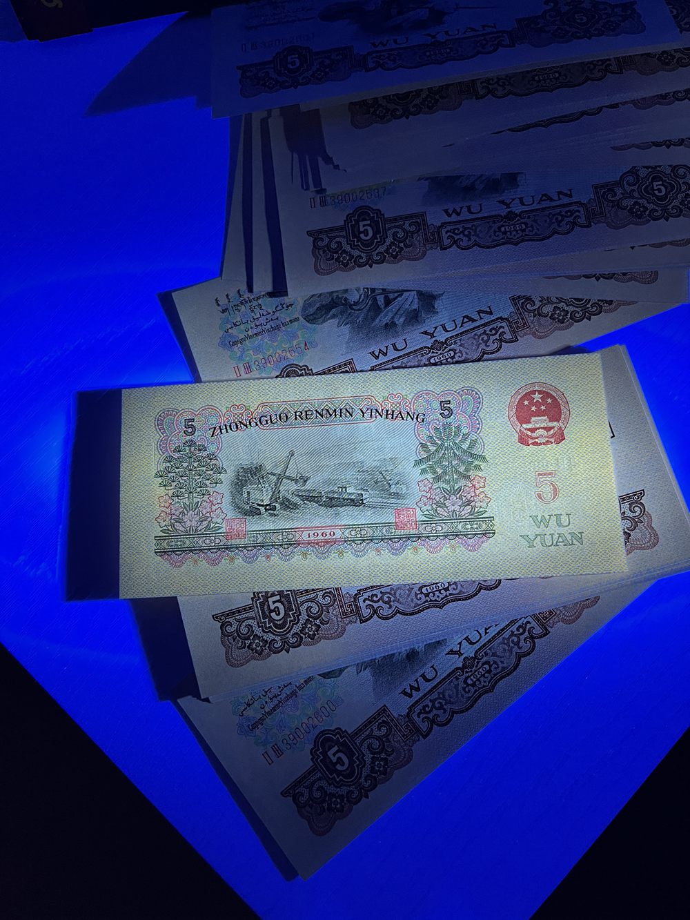 无47百联捆拆品相基本是就是决品非常好,灯下无斑放柜台几年第一张颜色一点浅,绝对是原票,尺寸长许多,荧光效果非常好,灯下无斑,4.7万。微信联系确认。