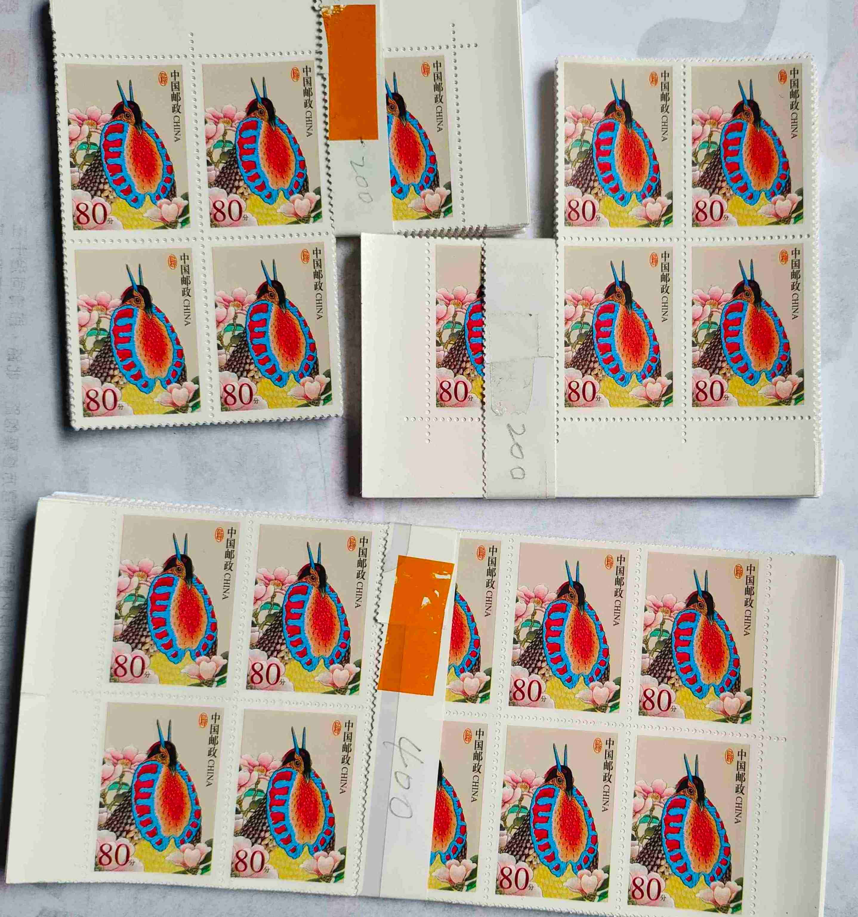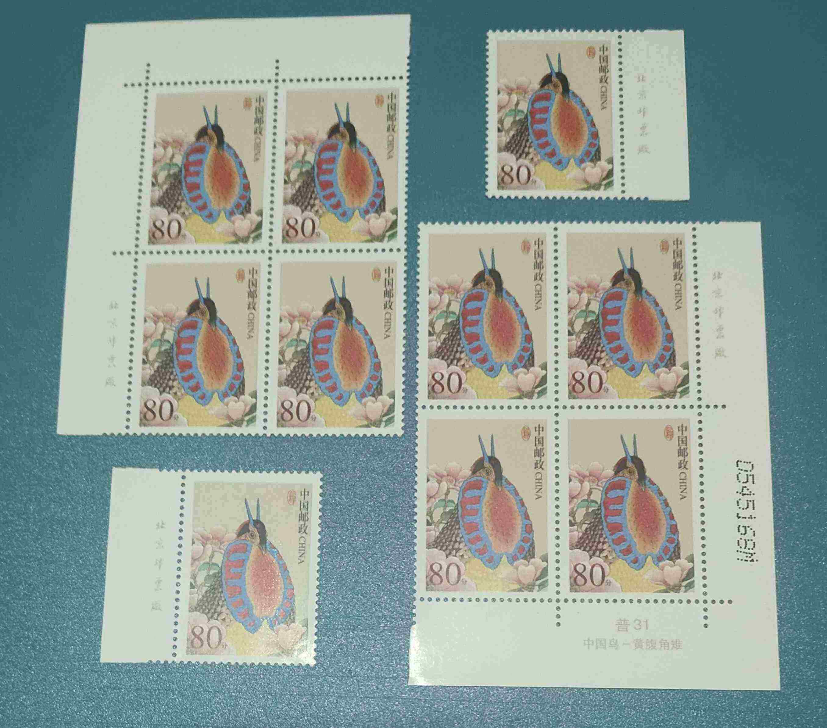 80分中国鸟左上角方、右下角方、左厂名、右厂名,10枚一组(如图10枚),
