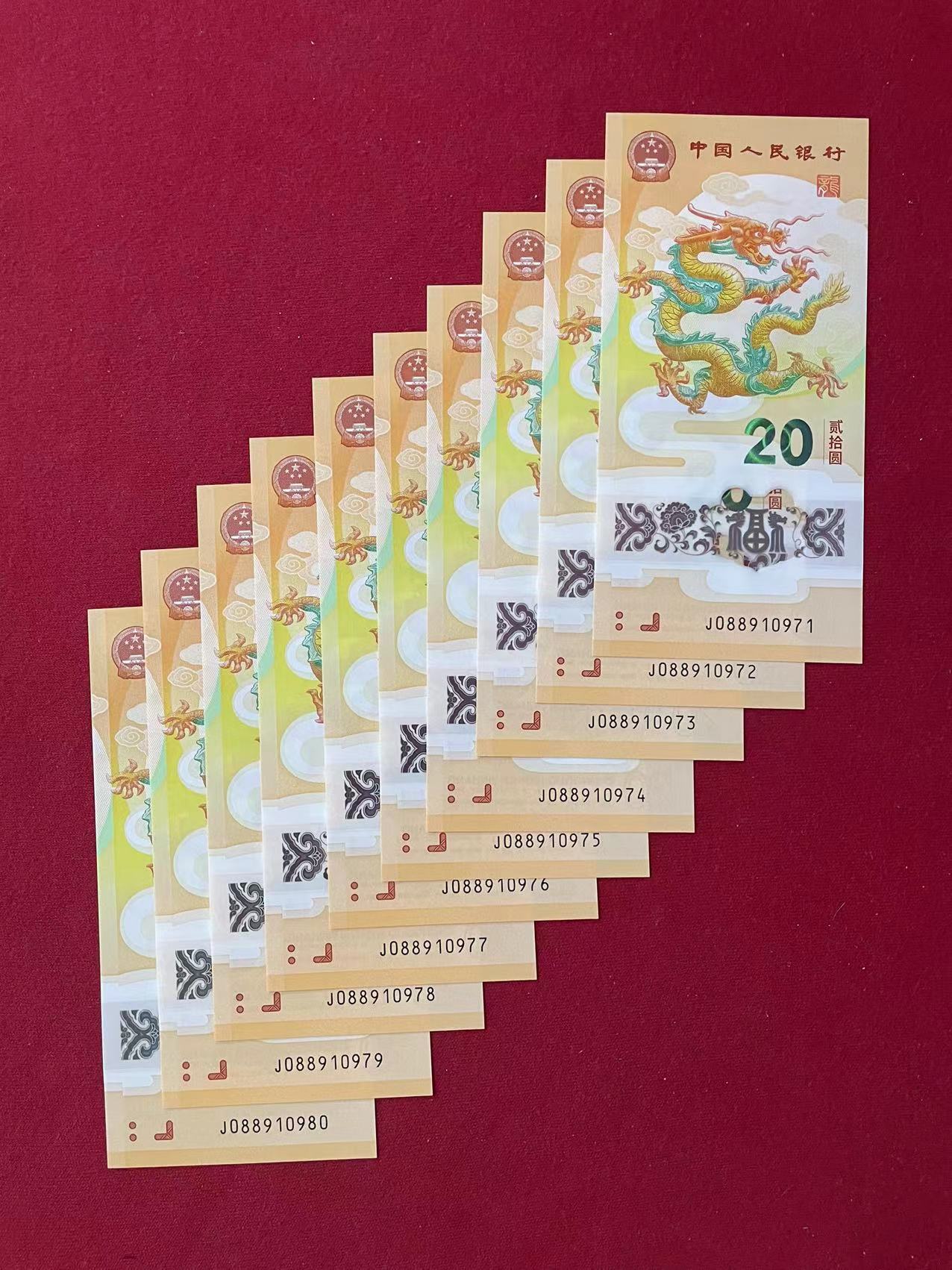 小龙钞带倒置号标十(0189),088910971----088910980,无指甲印、无折痕,可加微信看图,800元三包