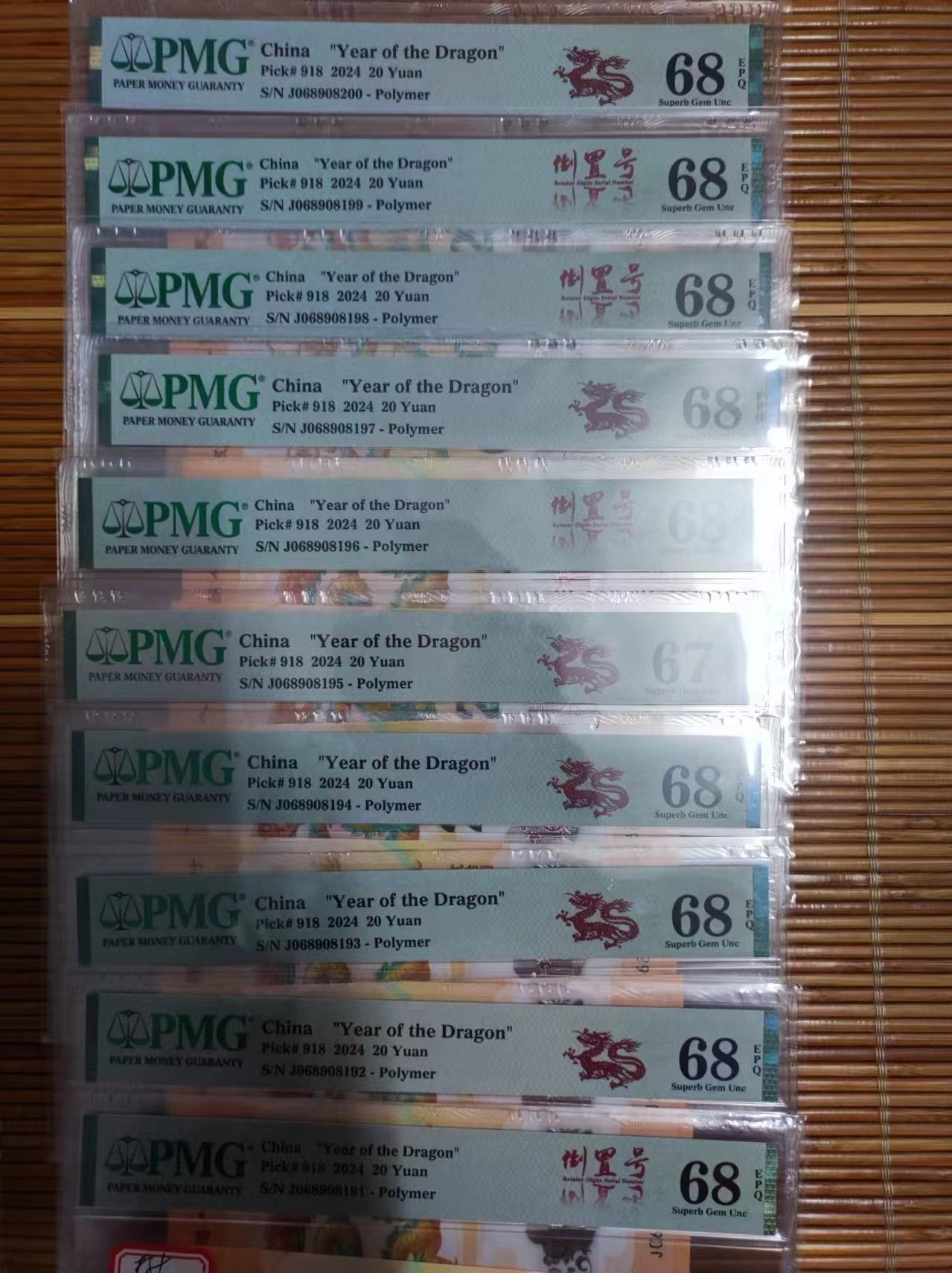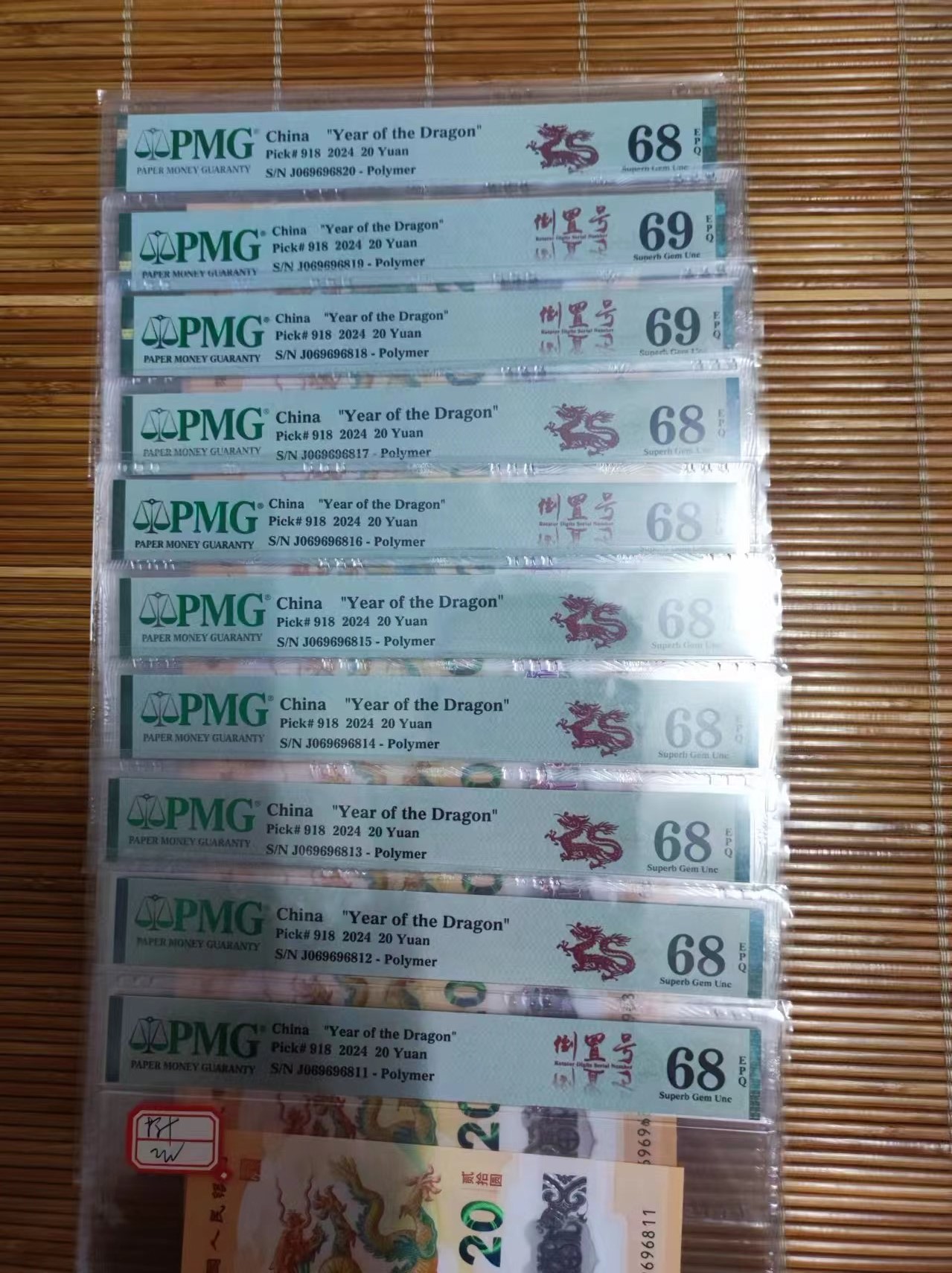 小龙钞2组标十,都是带倒置号,其中2张69e,若干张68e,通走9000包快!