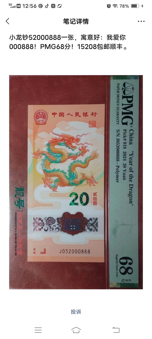 小龙钞52000888一张,寓意好:我爱你000888!PMG68分!价格15000,电联确认17337088805微信同号