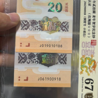 小龙钞倒置号尾8.。。2张,一张爱藏67分,。一张裸币。,,价格800X2=1600,,号码,019010108,061900918JUE品无斑。。无指甲印、